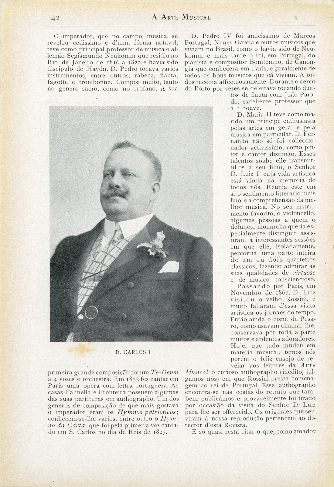 A arte musical : revista publicada quinzenalmente Ano 10, N.º 221, 29 de Fevereiro de 1908 capa verso publicidade publicidade Chronica theatral, por Alfredo Pinto (Sacavém) Noticiário [caricatura], por Francisco Valença publicidade publicidade verso contracapa | Ano 10, N.º 221, 29 de Fevereiro de 1908 > A música em Portugal e a Casa de Bragança > 0042 |