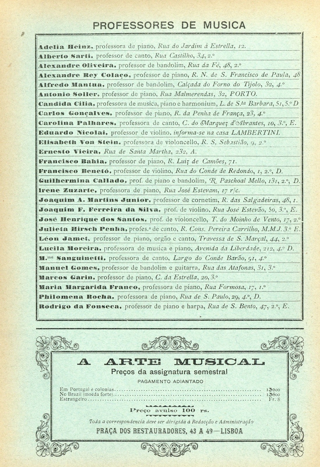 A arte musical : revista publicada quinzenalmente Ano 10, N.º 222, 15 de Março de 1908 capa verso publicidade publicidade Fantin-Latour (1836-1905) : Autour du piano (Museu do Luxemburgo, Paris), por Guido Joseph Joachim (cont.), por Carlos de Mello Notas vagas : cartas a uma Senhora, por Affonso Vargas Concertos Noticiário publicidade publicidade verso contracapa | Ano 10, N.º 222, 15 de Março de 1908 > contracapa |