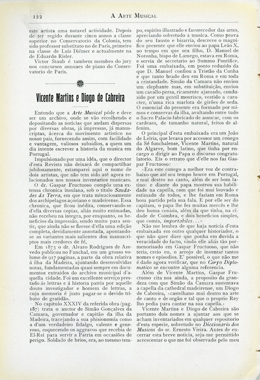 A arte musical : revista publicada quinzenalmente Ano 10, N.º 229, 30 de Junho de 1908 capa verso publicidade publicidade Victor Staub Vicente Martins e Diogo de Cabreira, por Sousa Viterbo O navio phantasma, por Annes Baganha ; Óscar da Silva (Mazurkas) Charada musical Bibliographia musical portugueza ; Necrologia publicidade publicidade verso contracapa | Ano 10, N.º 229, 30 de Junho de 1908 > Vicente Martins e Diogo de Cabreira, por Sousa Viterbo > 0122 |