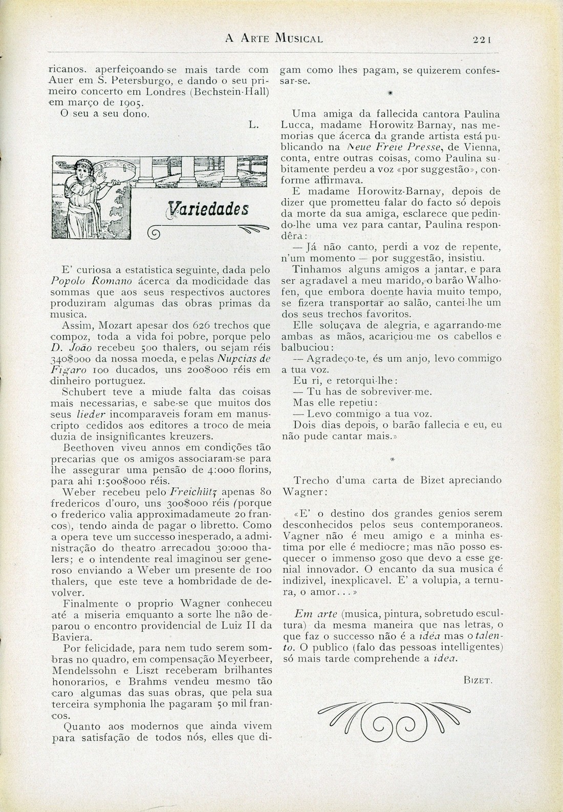 A arte musical : revista publicada quinzenalmente Ano 10, N.º 239, 30 de Novembro de 1908 capa verso publicidade publicidade Santa Cecilia Variedades Theatro de S. Carlos, por Esteves Lisboa Noticiário Necrologia publicidade publicidade verso contracapa | Ano 10, N.º 239, 30 de Novembro de 1908 > Variedades > 0221 |