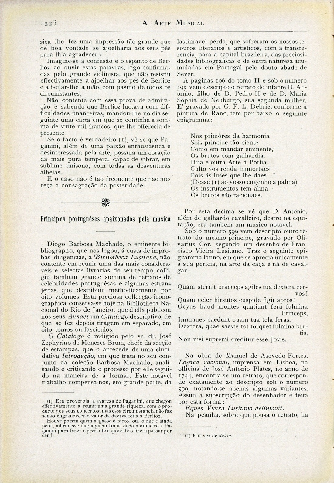 A arte musical : revista publicada quinzenalmente Ano 10, N.º 240, 15 de Dezembro de 1908 capa verso publicidade publicidade Paganini Theatro de S. Carlos, por Esteves Lisboa Notas vagas : cartas a uma Senhora, por Affonso Vargas Noticiário Necrologia publicidade publicidade publicidade verso contracapa | Ano 10, N.º 240, 15 de Dezembro de 1908 > Príncipes portugueses apaixonados pela música, por Sousa Viterbo > 0226 |