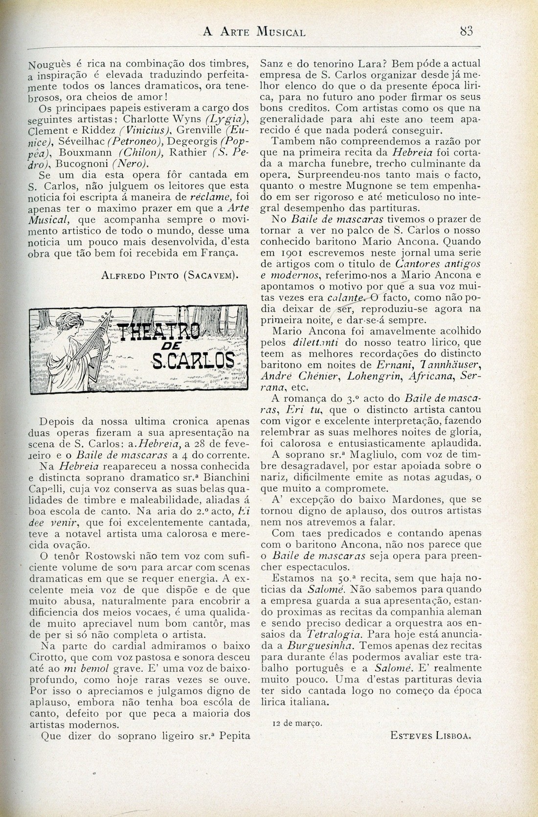 A arte musical : revista publicada quinzenalmente Ano 11, N.º 246, 15 de Março de 1909 capa verso publicidade publicidade J. Joachim Nin Theatro de S. Carlos, por Esteves Lisboa Notas vagas : cartas a uma Senhora, por Affonso Vargas Necrologia ; Caixa de Soccorro a Músicos Pobres por iniciativa da Arte Musical publicidade publicidade publicidade verso contracapa | Ano 11, N.º 246, 15 de Março de 1909 > Theatro de S. Carlos, por Esteves Lisboa > 0083 |