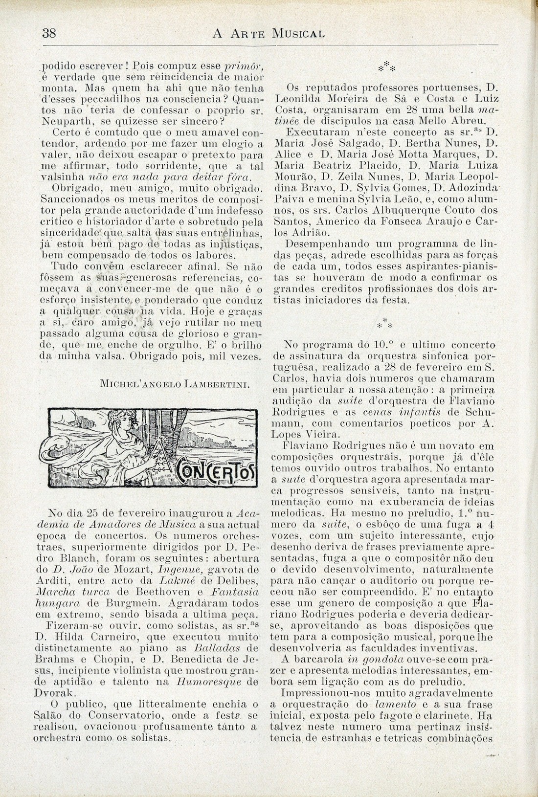 A arte musical : revista publicada quinzenalmente Ano 17, N.º 390, 15 de Março de 1915 Pela Índia (cont.) Curiosidades musicaes. 2.ª série, por Brito Rebello Carta do Porto, por Ernesto Maia Meio século de música, por Michel'Angelo Lambertini | Ano 17, N.º 390, 15 de Março de 1915 > Concertos > 0038 |