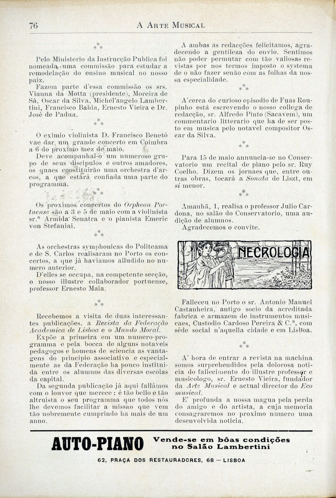 A arte musical : revista publicada quinzenalmente Ano 17, N.º 393, 30 de Abril de 1915 Curiosidades musicaes. 2.ª série, por Brito Rebello Carta do Porto, por Ernesto Maia Noticiário Necrologia | Ano 17, N.º 393, 30 de Abril de 1915 > Necrologia > 0076 |
