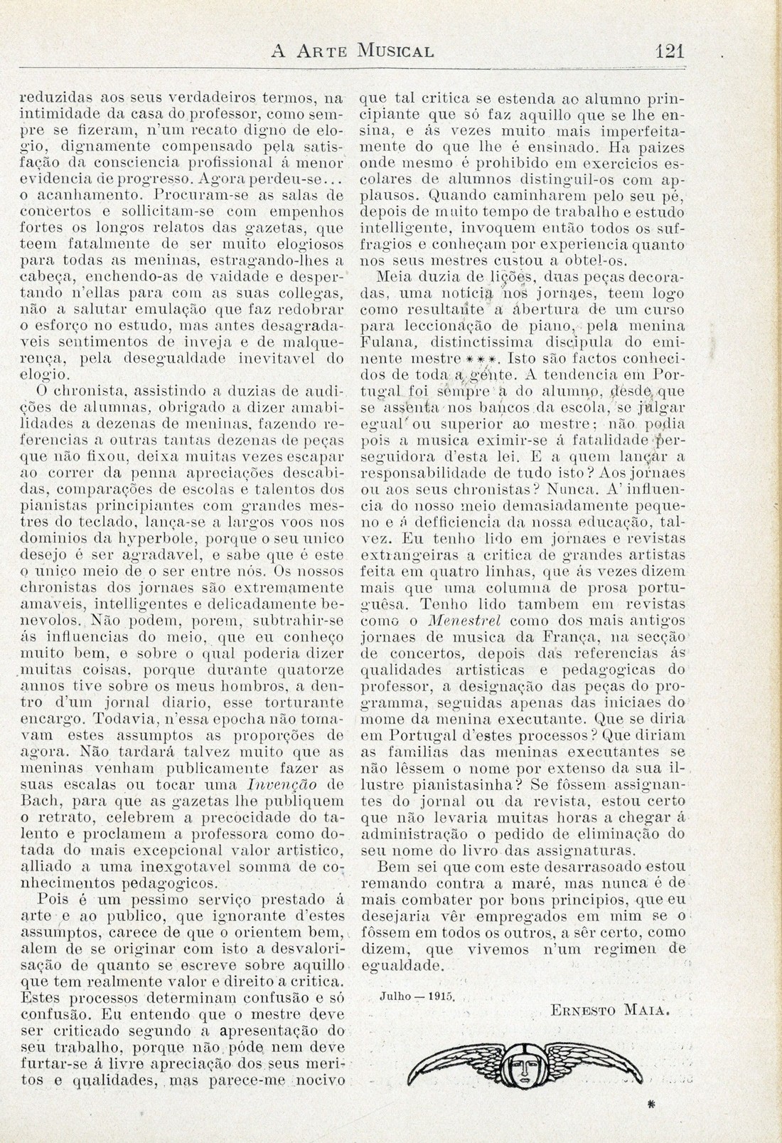 A arte musical : revista publicada quinzenalmente | Ano 17, N.º 398, 15 de Julho de 1915 > Carta do Porto, por Ernesto Maia > 0121 |