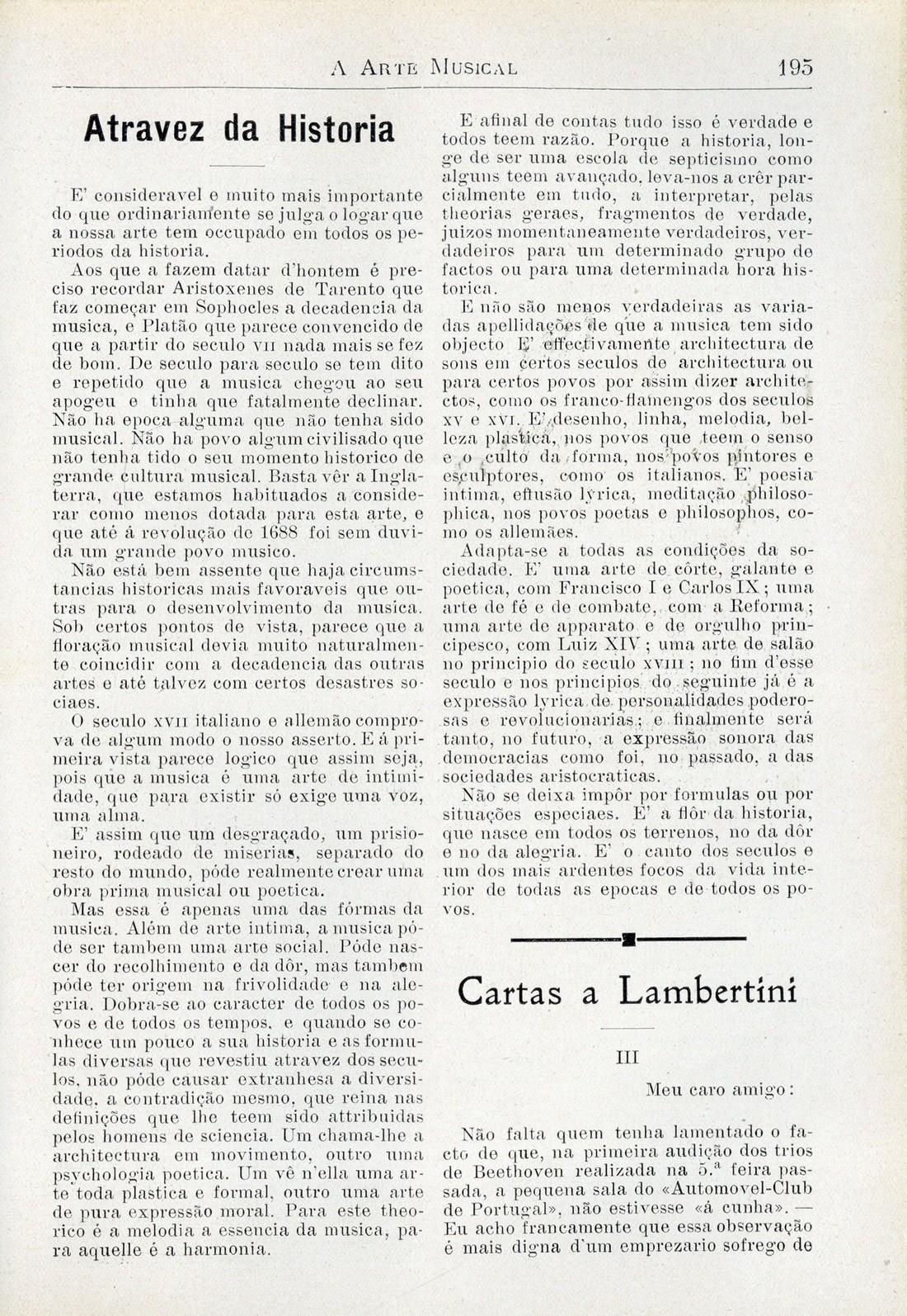 A arte musical : revista publicada quinzenalmente | Ano 17, N.º 407, 30 de Novembro de 1915 > Atravez da História ; Cartas a Lambertini, por Alexandre Rey Colaço > 0195 |