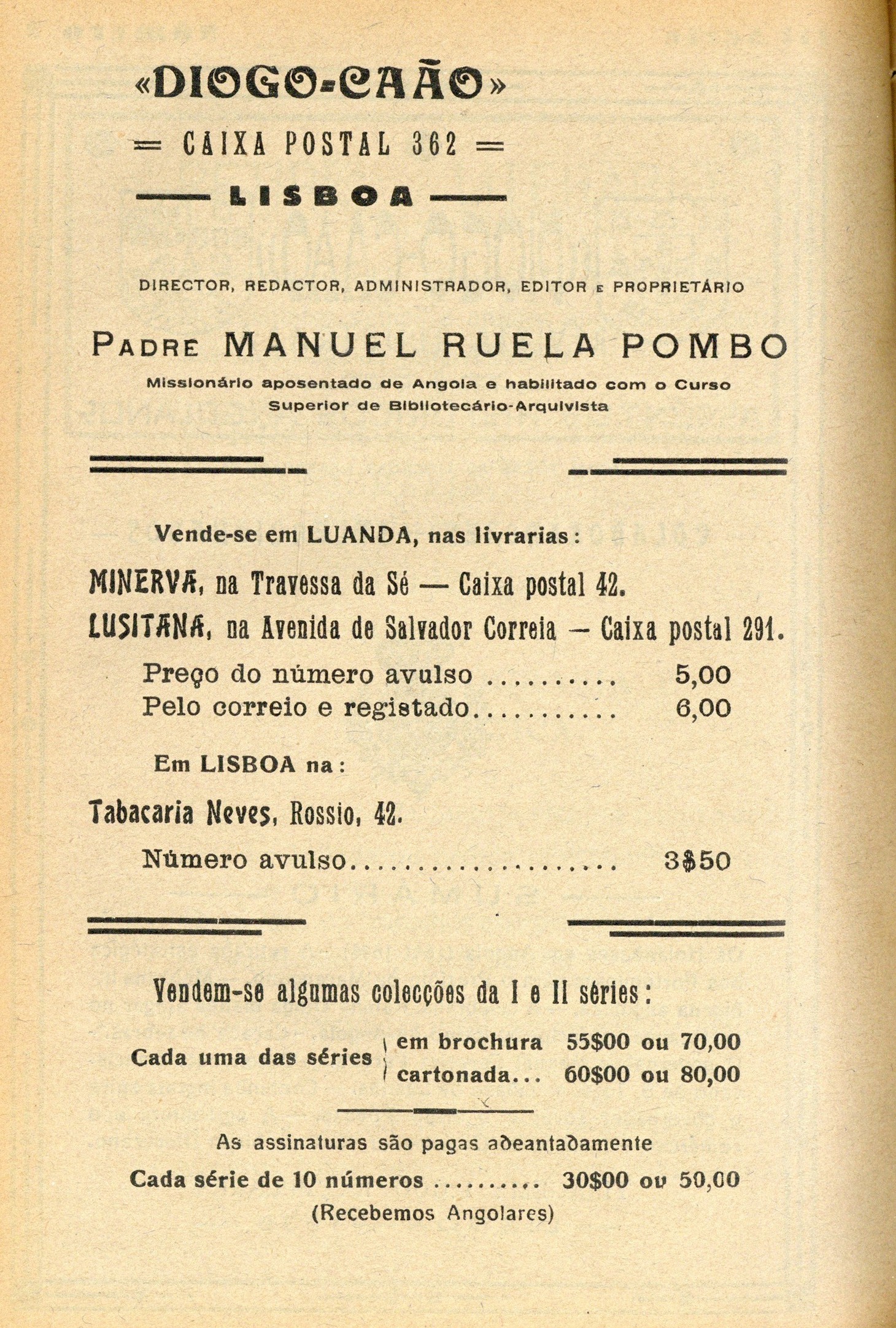 III série, n.º 2, 1935capa verso Os holandeses em Angola (1641-1648) [cont.] Medicina Indígena, por P[adre] P[ombo] [cont.] História Geral das Guerras Angolanas, por António de Oiveira de Cardornega História Eclesiástica de AngolaBiblioteca da Academia das Ciências : memórias do Convento de S. José de Angola, por Vicente Salgado [cont.] As lutas liberais em Angola [cont.] | III série, n.º 2, 1935 > verso Tipo:image/jpeg Tamanho:1 MB |