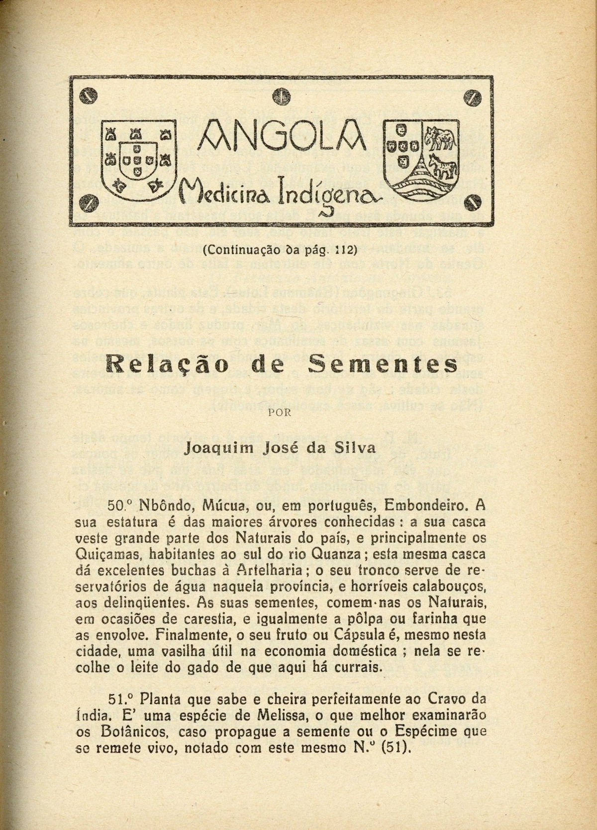III série, n.º 5, 1935capa verso As lútas liberais em Angola [cont.] História geral das Guerras Angolanas, por António de Oliveira Cadornega História Eclesiástica de AngolaBiblioteca da Academia das Ciências : memórias do Convento de S. José de Angola, por Vicente Salgado [cont.] Os holandeses em Angola (1641-1648) [cont.] Medicina IndígenaRelação de sementes, por Joaquim José da Silva Miscelânea de apontamentos velhos e antigos-impressões, comentários, crítica-nótas à margem & novidades, por P[adro] P[ombo] | III série, n.º 5, 1935 > Medicina Indígena > Relação de sementes, por Joaquim José da Silva > 0149 Tipo:image/jpeg Tamanho:583 KB |