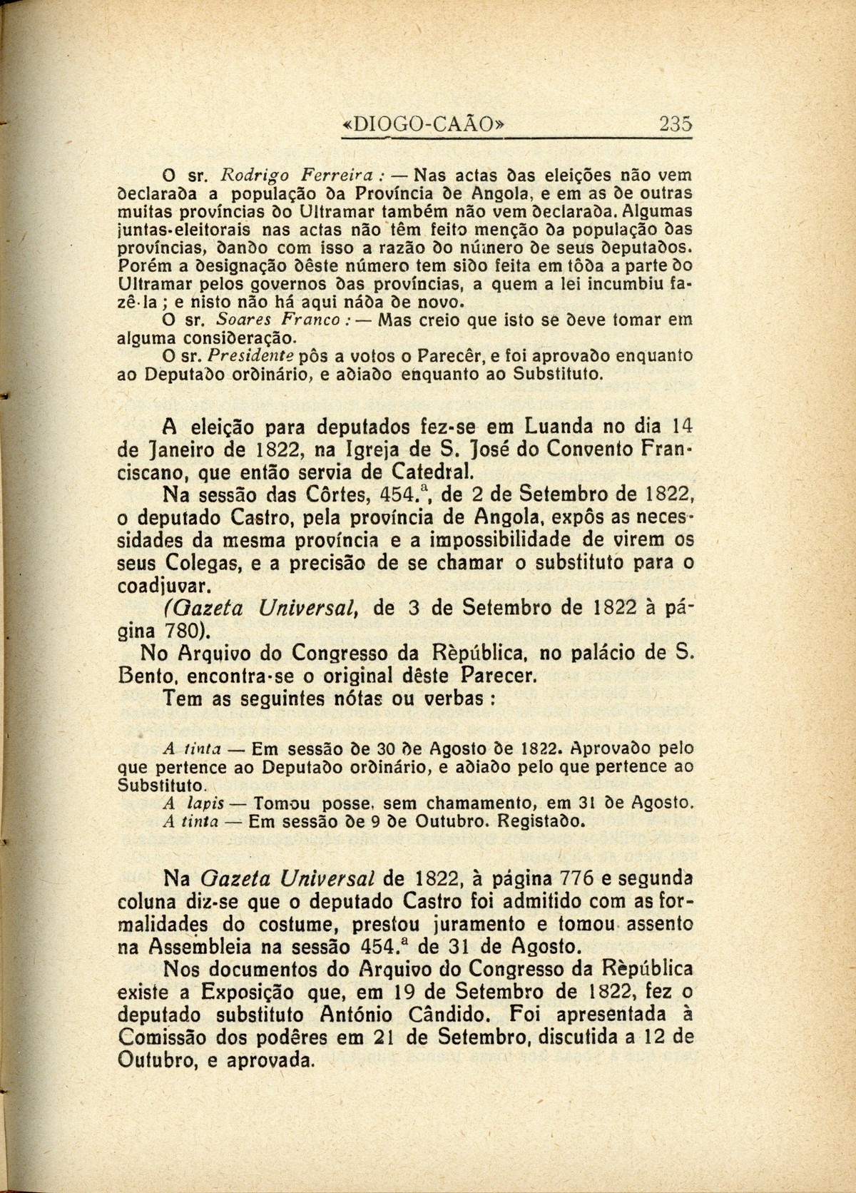 III série, n.º 8, 1936capa verso História geral das Guerras Angolanas, por António de Oliveira de Cadornega Com licença..., por Padre Ruela Pombo As lútas liberais em Angola [cont.] História Eclesiástica de AngolaBiblioteca da Academia das Ciências : memórias do Convento de S. José de Angola, por Vicente Salgado [conclusão] Miscelânea de apontamentos velhos e antigos-impressões, comentários, crítica-nótas à margem & novidades, por P[adre] P[ombo] | III série, n.º 8, 1936 > As lútas liberais em Angola [cont.] > 0235 Tipo:image/jpeg Tamanho:680 KB |