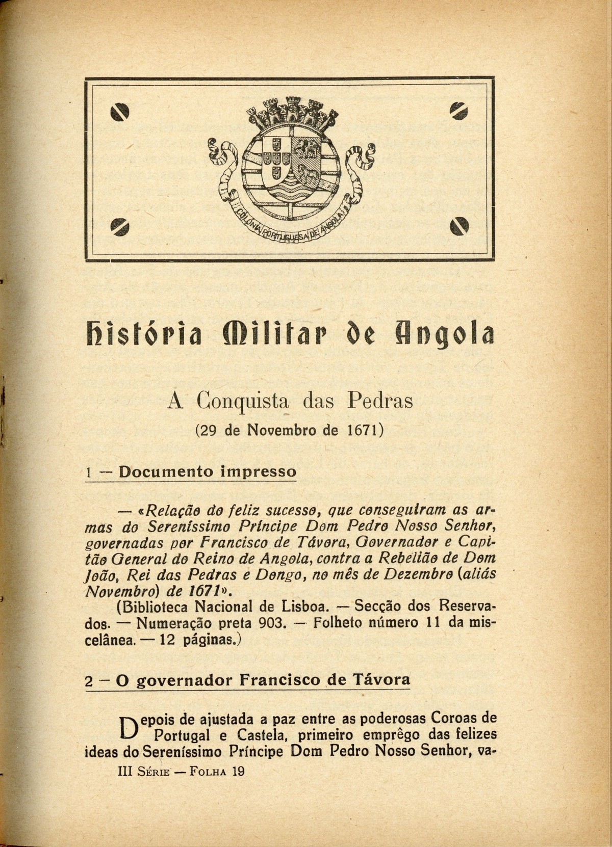 Diogo-Cão : revista ilustrada de assuntos históricos III série, n.º 10, 1936 capa verso História militar de Angola Portugal Ultramarino, por Padre Pombo História geral das Guerras Angolanas, por António de Oliveira de Cadornega verso contracapa | III série, n.º 10, 1936 > História militar de Angola > A Conquista das Pedras (29 de Novembro de 1671) > 0289 |