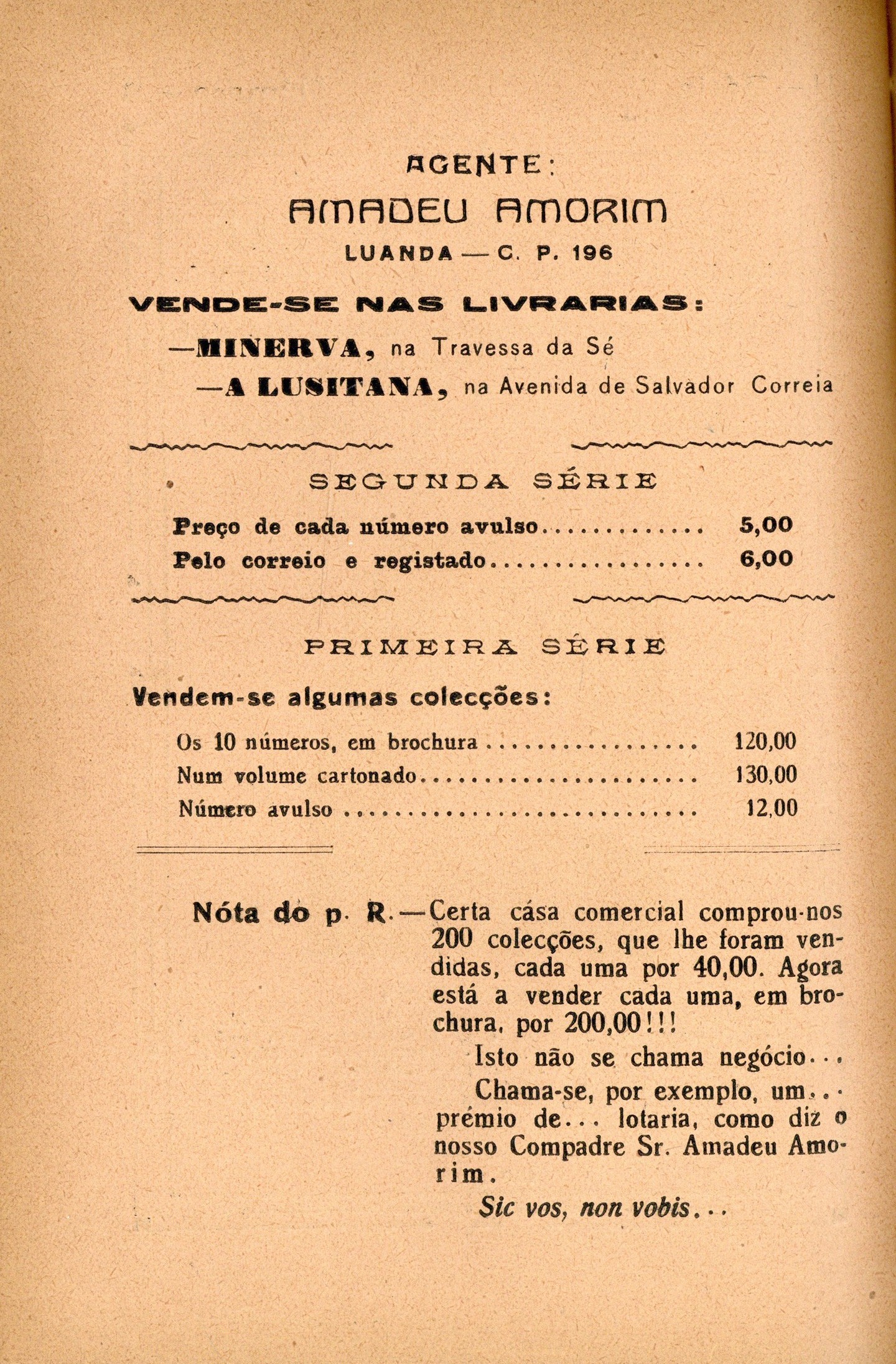 II série, n.º 3, 1933capa verso Sindicância aos actos de Paulo Dias de Novais [conclusão] Questões marítimas internacionaisOs portugueses & os ingleses [cont.] No tempo do Marquês-de-Pombal...O indúlto a favor do Dr. Seabra da Silva, por P[adre] R[uela] [conclusão] Presídios angolanosPedras-Negras de Pungo-Andongo (1671), por José Matias Delgado Miscelânea de apontamentos velhos e antigos-impressões, comentários, crítica-nótas à margem & novidades | II série, n.º 3, 1933 > verso Tipo:image/jpeg Tamanho:1 MB |