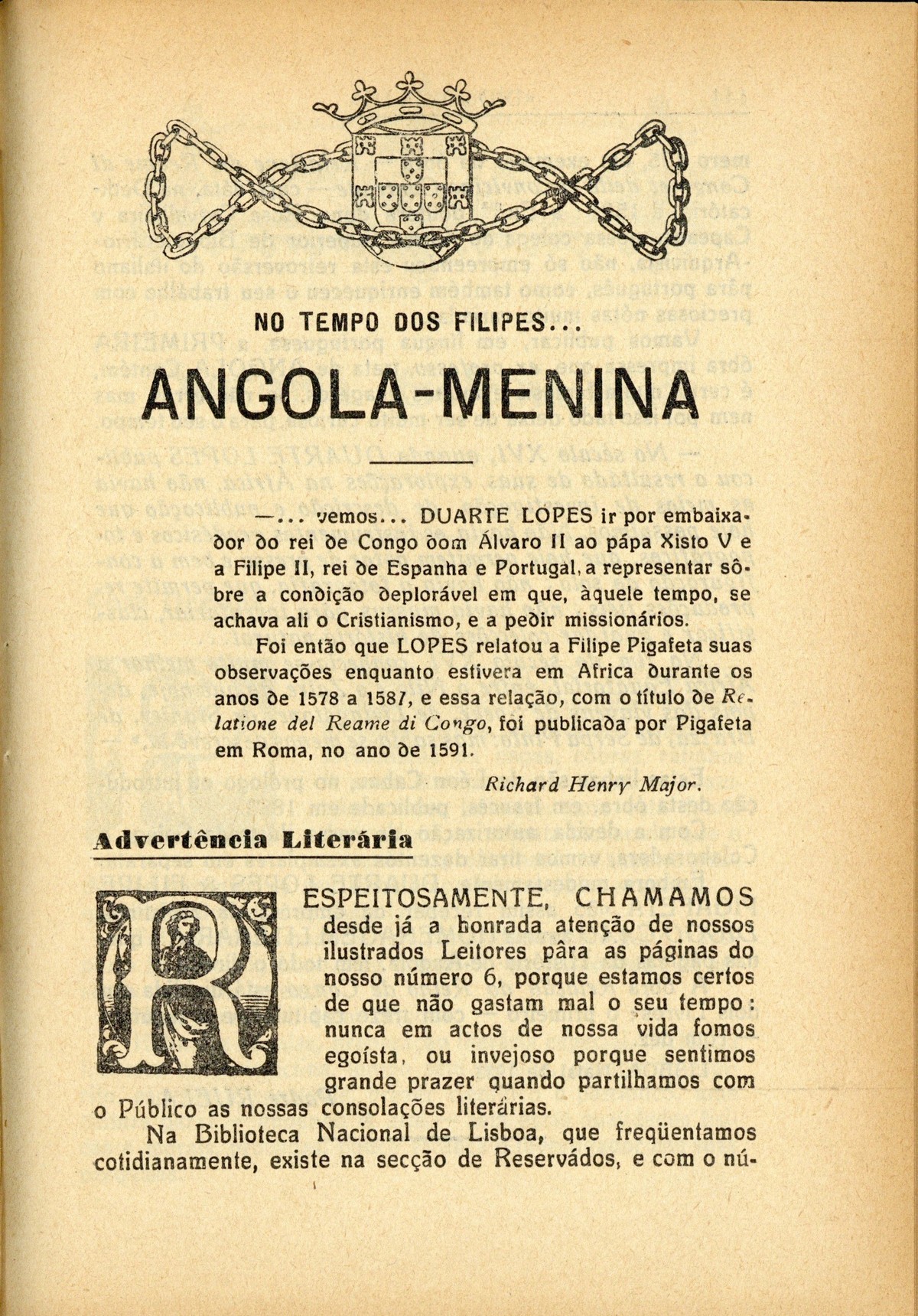 II série, n.º 5, 1933capa verso História de Angola, por Padre Ruela História general das Guerras Angolanas, por António de Oliveira de Cadornega No tempo dos FilipesAngola-Menina, por Padre Ruela Miscelânea de apontamentos velhos e antigos-impressões, comentários, crítica-nótas à margem & novidades | II série, n.º 5, 1933 > No tempo dos Filipes > Angola-Menina, por Padre Ruela > 0143 Tipo:image/jpeg Tamanho:678 KB |