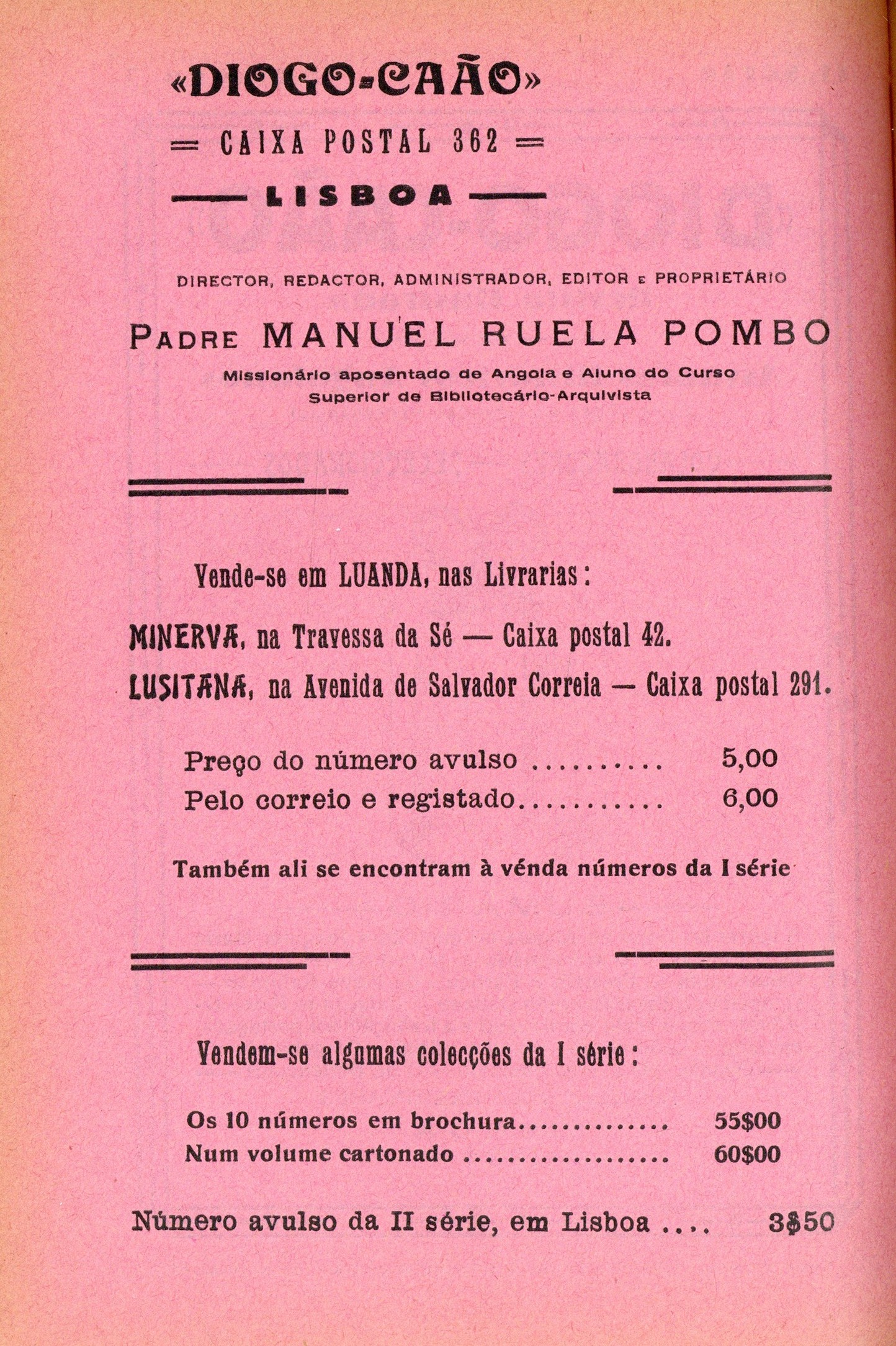 II série, n.º 7, 1934capa verso Relação do Reino de Congo e das terras circunvizinhas História general das Guerras Angolanas, por António de Oliveirade Cadornega Miscelânea de apontamentos velhos e antigos-impressões, comentários, crítica-nótas à margem & novidades | II série, n.º 7, 1934 > verso Tipo:image/jpeg Tamanho:984 KB |