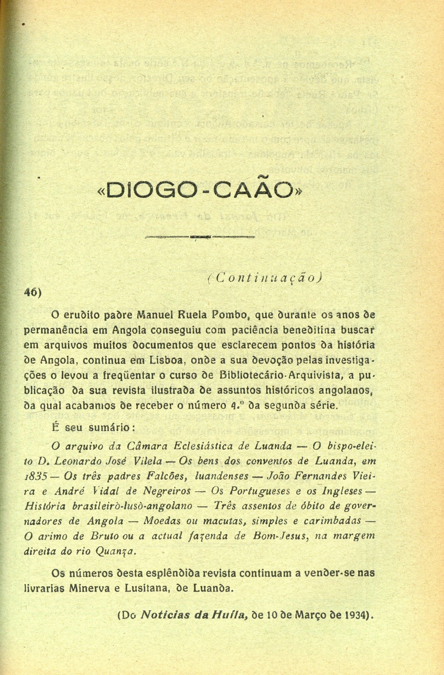 II série, n.º 8, 1934capa verso Efemérides provinciaisCatálogo dos Governadores de Angola, por José Matias Delgado [cont.] História general das Guerras Angolanas [cont.] Relação do Reino do Congo e das terras circunvizinhas [cont.] Miscelânea de apontamentos velhos e antigos-impressões, comentários, crítica-nótas à margem & novidades, por Padre Pombo | II série, n.º 8, 1934 > Miscelânea de apontamentos velhos e antigos-impressões, comentários, crítica-nótas à margem & novidades, por Padre Pombo > verso Tipo:image/jpeg Tamanho:1 MB |