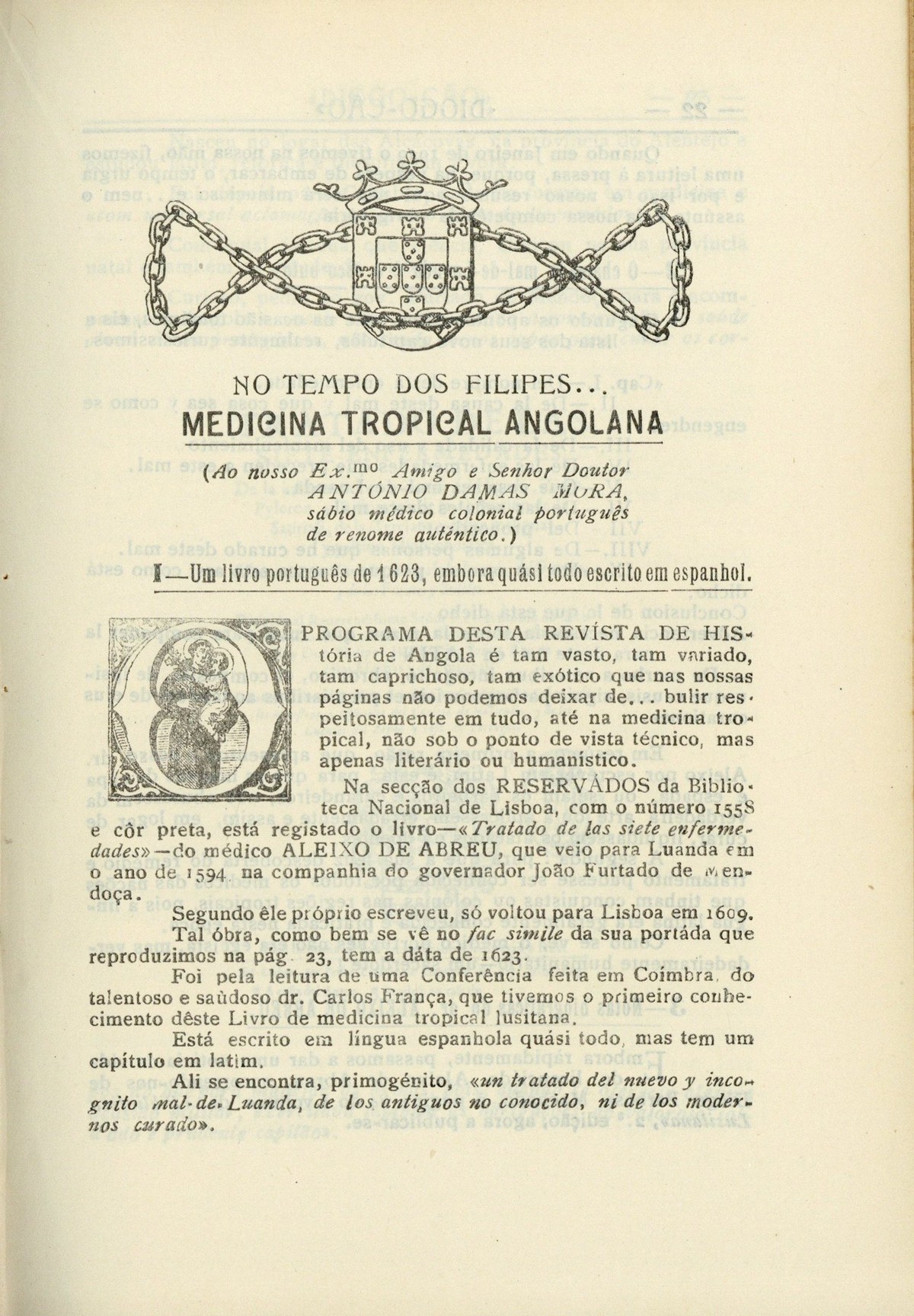I série, n.º 1, 1931capa verso rosto 0002 Os portugueses em AngolaDiogo Cão, por P[adre] R[uela] As Fortalezas de LuandaA Fortaleza do Môrro Sam-Paulo, por P[adre] R[uela] Efemérides ProvinciaisCatálogo ou lista dos Governadores de Angola, com as respectivas provas, por José Matias Delgado Monumentos & ArquivosPrograma-Tese , por Padre Ruela História EclesiásticaMissões e Missionários, por P[adre] R[uela] No Tempo dos Filipes...Medicina tropical angolana, por Padre Ruela Miscelânea de apontamentos velhos e antigos-impressões, comentários, crítica-nótas á margem & novidades, por Padre Ruela | I série, n.º 1, 1931 > No Tempo dos Filipes... > Medicina tropical angolana, por Padre Ruela > 0021 Tipo:image/jpeg Tamanho:522 KB |