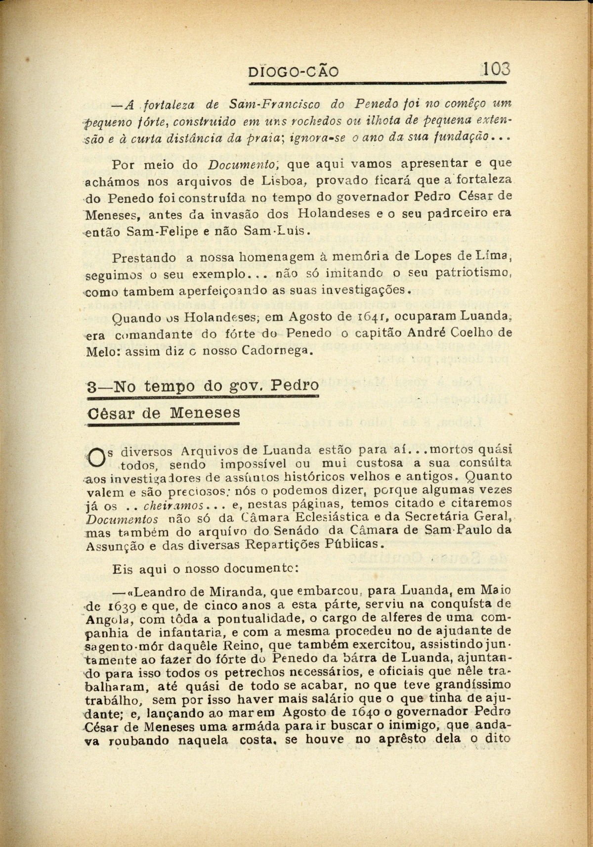 Diogo-Cão : revista ilustrada de assuntos históricos I série, n.º 4, 1932 capa verso As Fortalezas de Luanda Efemérides Provinciais A tentação do mar verso contracapa A Marinha Portuguesa : no reinado de Dom Fernando, por Visconde de Santarém ; As razões das descobértas, por Aires de Sá Seuta e não Ceuta 21 de Agosto de 1415, por Ernesto de Vasconcelos Relíquias históricas, por Gago Coutinho O Testamento de Adão ; A história da briosa Marinha Portuguesa [cont.] Bênção arqueológica, por Padre Ruela | I série, n.º 4, 1932 > As Fortalezas de Luanda > A Fortaleza do Penedo Sam-Filipe, por Padre Ruela > 0103 |