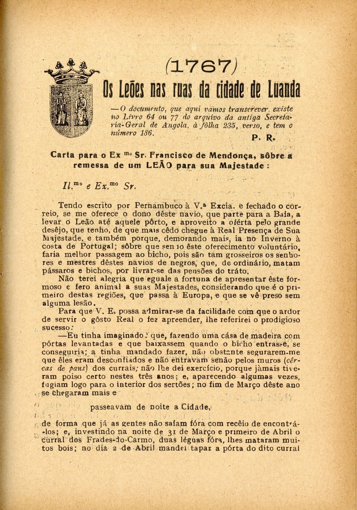 Diogo-Cão : revista ilustrada de assuntos históricos I série, n.º 8, 1932 capa verso História da Colonização Portuguesa de Angola Efemérides Provinciais A tentação do mar verso contracapa Com licença..., por Padre Ruela Defesa das terras descobertas, por Henrique Major O mistério das navegações, por E. A. Bettencourt ; O resgáte dos escravos, por Fortunato de Almeida ; as cartas-de-marear, por Sousa Viterbo Descobérta de Pôrto-Santo (1418), por Damião de Góis Sôbre o Infante-dom-Henrique..., por P[adre] R[uela] | I série, n.º 8, 1932 > Os leões nas ruas da cidade de Luanda, por P[adre] R[uela] > 0233 |
