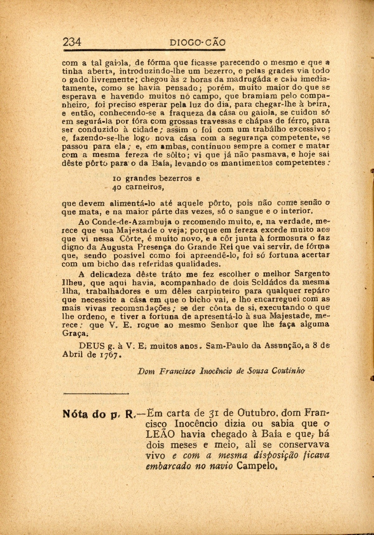 Diogo-Cão : revista ilustrada de assuntos históricos I série, n.º 8, 1932 capa verso História da Colonização Portuguesa de Angola Efemérides Provinciais A tentação do mar verso contracapa Com licença..., por Padre Ruela Defesa das terras descobertas, por Henrique Major O mistério das navegações, por E. A. Bettencourt ; O resgáte dos escravos, por Fortunato de Almeida ; as cartas-de-marear, por Sousa Viterbo Descobérta de Pôrto-Santo (1418), por Damião de Góis Sôbre o Infante-dom-Henrique..., por P[adre] R[uela] | I série, n.º 8, 1932 > Os leões nas ruas da cidade de Luanda, por P[adre] R[uela] > 0234 |