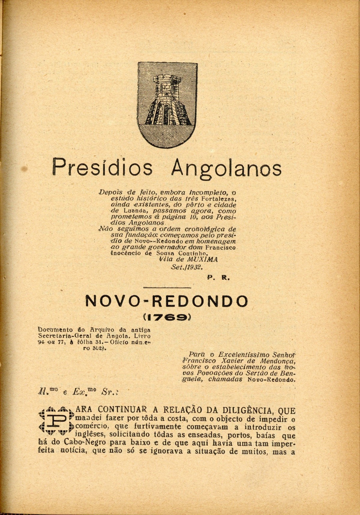 Diogo-Cão : revista ilustrada de assuntos históricos I série, n.º 8, 1932 capa verso História da Colonização Portuguesa de Angola Efemérides Provinciais A tentação do mar verso contracapa Com licença..., por Padre Ruela Defesa das terras descobertas, por Henrique Major O mistério das navegações, por E. A. Bettencourt ; O resgáte dos escravos, por Fortunato de Almeida ; as cartas-de-marear, por Sousa Viterbo Descobérta de Pôrto-Santo (1418), por Damião de Góis Sôbre o Infante-dom-Henrique..., por P[adre] R[uela] | I série, n.º 8, 1932 > Presídios angolanos > Novo-Redondo (1769) > 0237 |