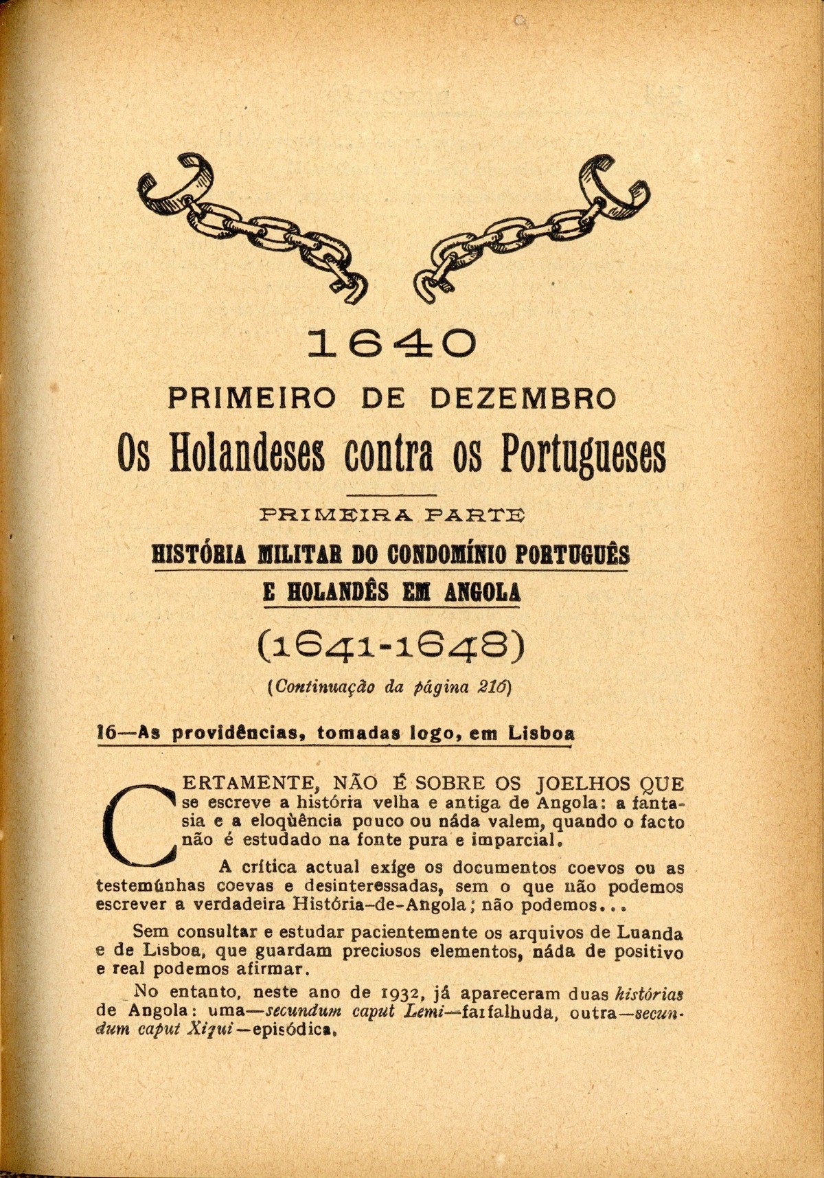 Diogo-Cão : revista ilustrada de assuntos históricos I série, n.º 8, 1932 capa verso História da Colonização Portuguesa de Angola Efemérides Provinciais A tentação do mar verso contracapa Com licença..., por Padre Ruela Defesa das terras descobertas, por Henrique Major O mistério das navegações, por E. A. Bettencourt ; O resgáte dos escravos, por Fortunato de Almeida ; as cartas-de-marear, por Sousa Viterbo Descobérta de Pôrto-Santo (1418), por Damião de Góis Sôbre o Infante-dom-Henrique..., por P[adre] R[uela] | I série, n.º 8, 1932 > 1640 Primeiro de Dezembro > Os holandeses contra os portugueses [cont.] > 0243 |