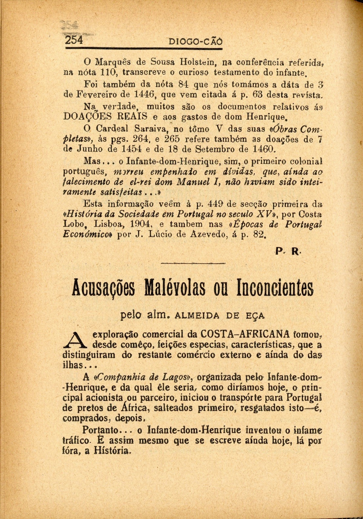Diogo-Cão : revista ilustrada de assuntos históricos I série, n.º 8, 1932 capa verso História da Colonização Portuguesa de Angola Efemérides Provinciais A tentação do mar verso contracapa Com licença..., por Padre Ruela Defesa das terras descobertas, por Henrique Major O mistério das navegações, por E. A. Bettencourt ; O resgáte dos escravos, por Fortunato de Almeida ; as cartas-de-marear, por Sousa Viterbo Descobérta de Pôrto-Santo (1418), por Damião de Góis Sôbre o Infante-dom-Henrique..., por P[adre] R[uela] | I série, n.º 8, 1932 > A tentação do mar > Acusações malévolas ou inconcientes, por Almeida de Eça > 0254 |