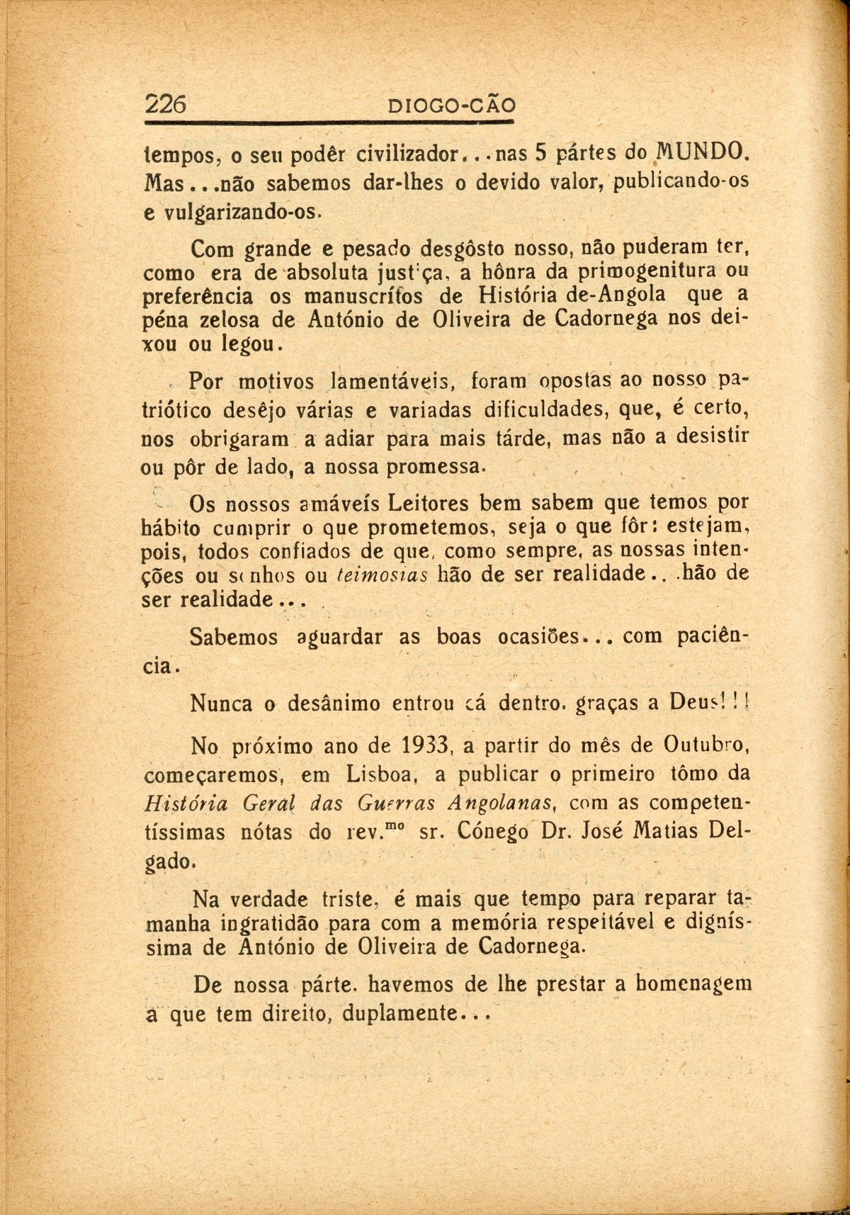 Diogo-Cão : revista ilustrada de assuntos históricos I série, n.º 8, 1932 capa verso História da Colonização Portuguesa de Angola Efemérides Provinciais A tentação do mar verso contracapa Com licença..., por Padre Ruela Defesa das terras descobertas, por Henrique Major O mistério das navegações, por E. A. Bettencourt ; O resgáte dos escravos, por Fortunato de Almeida ; as cartas-de-marear, por Sousa Viterbo Descobérta de Pôrto-Santo (1418), por Damião de Góis Sôbre o Infante-dom-Henrique..., por P[adre] R[uela] | I série, n.º 8, 1932 > História da Colonização Portuguesa de Angola > Os inéditos de Cadornega, por Padre Ruela > 0226 |