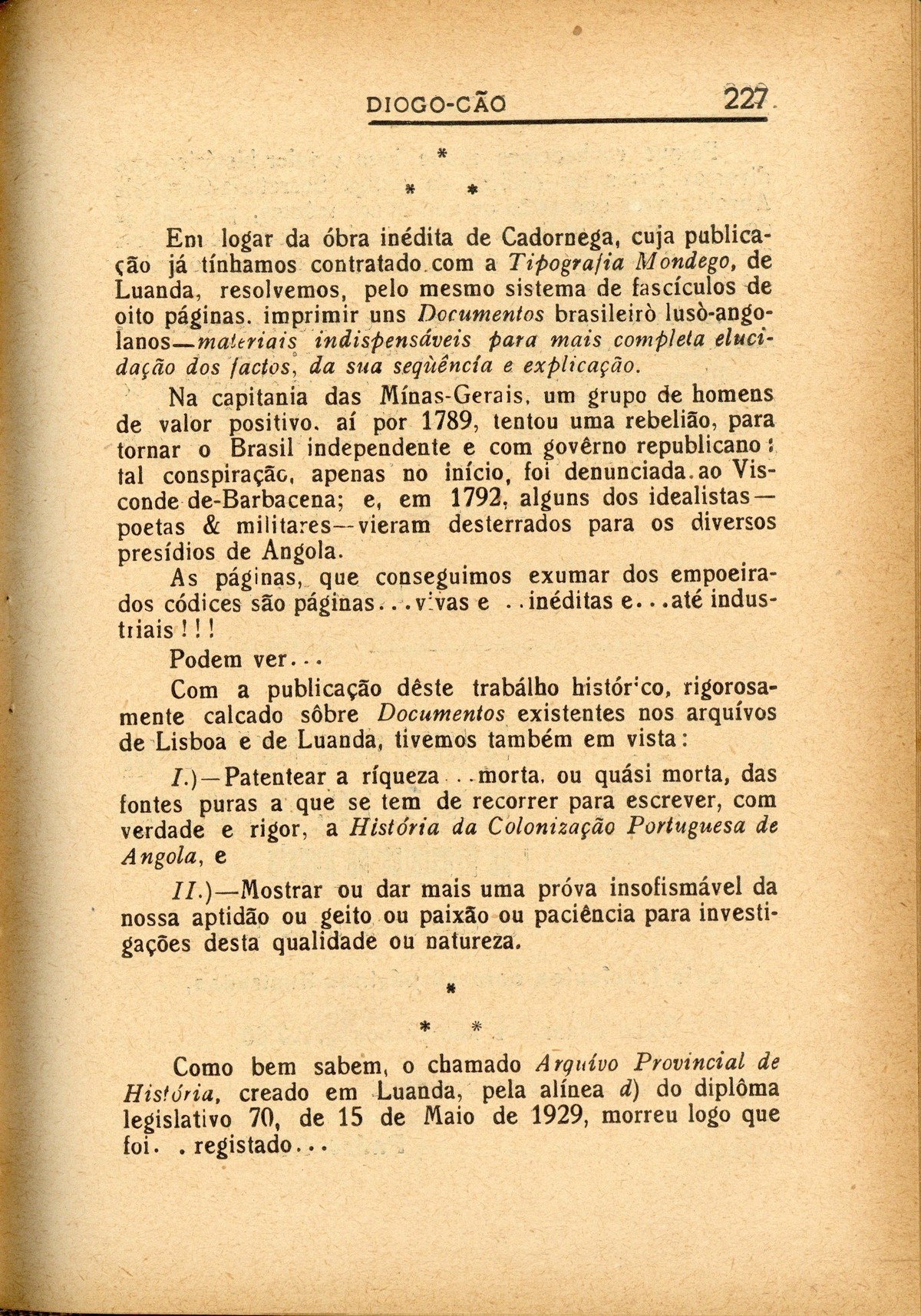 Diogo-Cão : revista ilustrada de assuntos históricos I série, n.º 8, 1932 capa verso História da Colonização Portuguesa de Angola Efemérides Provinciais A tentação do mar verso contracapa Com licença..., por Padre Ruela Defesa das terras descobertas, por Henrique Major O mistério das navegações, por E. A. Bettencourt ; O resgáte dos escravos, por Fortunato de Almeida ; as cartas-de-marear, por Sousa Viterbo Descobérta de Pôrto-Santo (1418), por Damião de Góis Sôbre o Infante-dom-Henrique..., por P[adre] R[uela] | I série, n.º 8, 1932 > História da Colonização Portuguesa de Angola > Os inéditos de Cadornega, por Padre Ruela > 0227 |