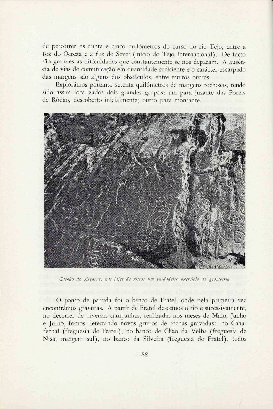 Olisipo : boletim do Grupo "Amigos de Lisboa" A. XXXV, n.º 135, Julho/Dezembro 1972 capa verso rosto / sumário 0074 Arte Rupestre Tagana 0075 I - Achado de Arte Rupestre nas margens do Tejo, por Paulo Caratão Soromenho II - Problemas de ordem cronológica e atribuição funcional, por Eduardo da Cunha Serrão São Vicente maravilhoso padrinho da Lusa Capital (argumento literário para o filme do centenário, de 1973), por Francisco Santos Costa Bento de Moura Portugal na Lisboa do século XVIII, por Abílio Mendes do Amaral A Luís de Camões nas celebrações do 4.º Centenário da publicação da 1.ª edição de «Os Lusíadas», por Inocêncio Castelhano Gago Coutinho : geógrafo, por Manoel Affonso Dias Doces lembranças do Convento de Odivelas, por Paulo Caratão Soromenho publicidade contracapa | A. XXXV, n.º 135, Julho/Dezembro 1972 > Arte Rupestre Tagana > III - Unidade geográfica, geológica, técnica e temática da estação de Arte Rupestre do Vale do Tejo, por Francisco de Sande Lemos > 0088 |