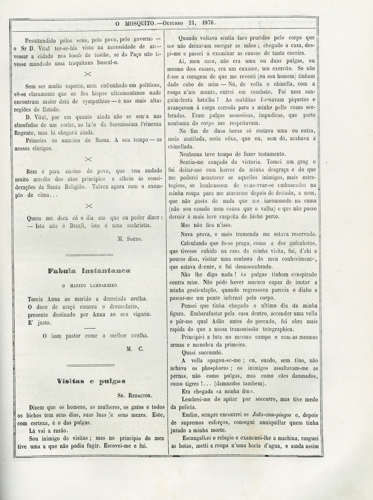 O mosquito A. 8, n.º 388, 21 Outubro 1876 capa [ilustração], por Bordalo Pinheiro Expediente ; A chegada de D. Vital, por M. Souto Fabula instantanea, por M. C. ; Visitas e pulgas, por Ambrósio Enganatres A questão religiosa [ilustração], por Bordalo Pinheiro Esta é que é a questão [ilustração], por Bordalo Pinheiro Uma regencia modelo, por Serra ; C'est la fa...talité!, por Serra Fabula instantanea, por F. d'Almeida Os engeitados [ilustração], por Bordalo Pinheiro | A. 8, n.º 388, 21 Outubro 1876 > Fabula instantanea, por M. C. ; Visitas e pulgas, por Ambrósio Enganatres > 0003 |