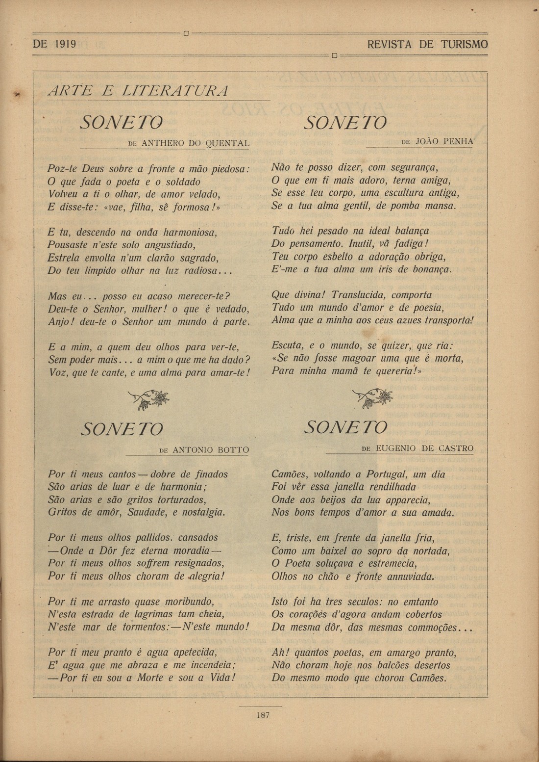 Revista de turismo: publicação quinzenal de turismo, propaganda, viagens, navegação, arte e literatura N.º 72, 20 Jun. 1919 Brasil e Portugal : uma visita histórica, por José Lisboa A "Revista de Turismo" ; Notícias diversas Arte e literatura : Sonetos, de Antero de Quental, António Botto, João Pessanha e Eugénio de Castro Termas portuguesas : Entre-os-Rios Caldas de Monchique Cartas de Paris, por Guerra Maio | N.º 72, 20 Jun. 1919 > Arte e literatura : Sonetos, de Antero de Quental, António Botto, João Pessanha e Eugénio de Castro > 0187 |