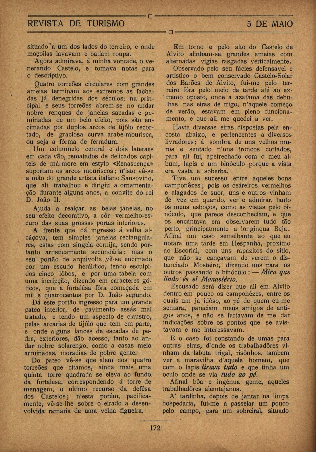 Revista de turismo: publicação quinzenal de turismo, propaganda, viagens, navegação, arte e literatura N.º 119, 5 Mai. 1922 A visita dos Americanos a Portugal, por J. L. Perante a América do Norte : a arte em Portugal : a janela do Convento de Cristo de Tomar, por Brandão Pereira Poetas e artistas : Canção, de António Botto Turismo e hipismo : o grande Concurso Hípico da Primavera, por J. L. Turismo estrangeiro : os Americanos na Europa, por Guerra Maio Portugal pitoresco : a Serra da Lapa e a Capela de Nossa Senhora Notícias diversas | N.º 119, 5 Mai. 1922 > Belezas Nacionais : um dia em Alvito, por Ribeiro Cristino > 0172 |