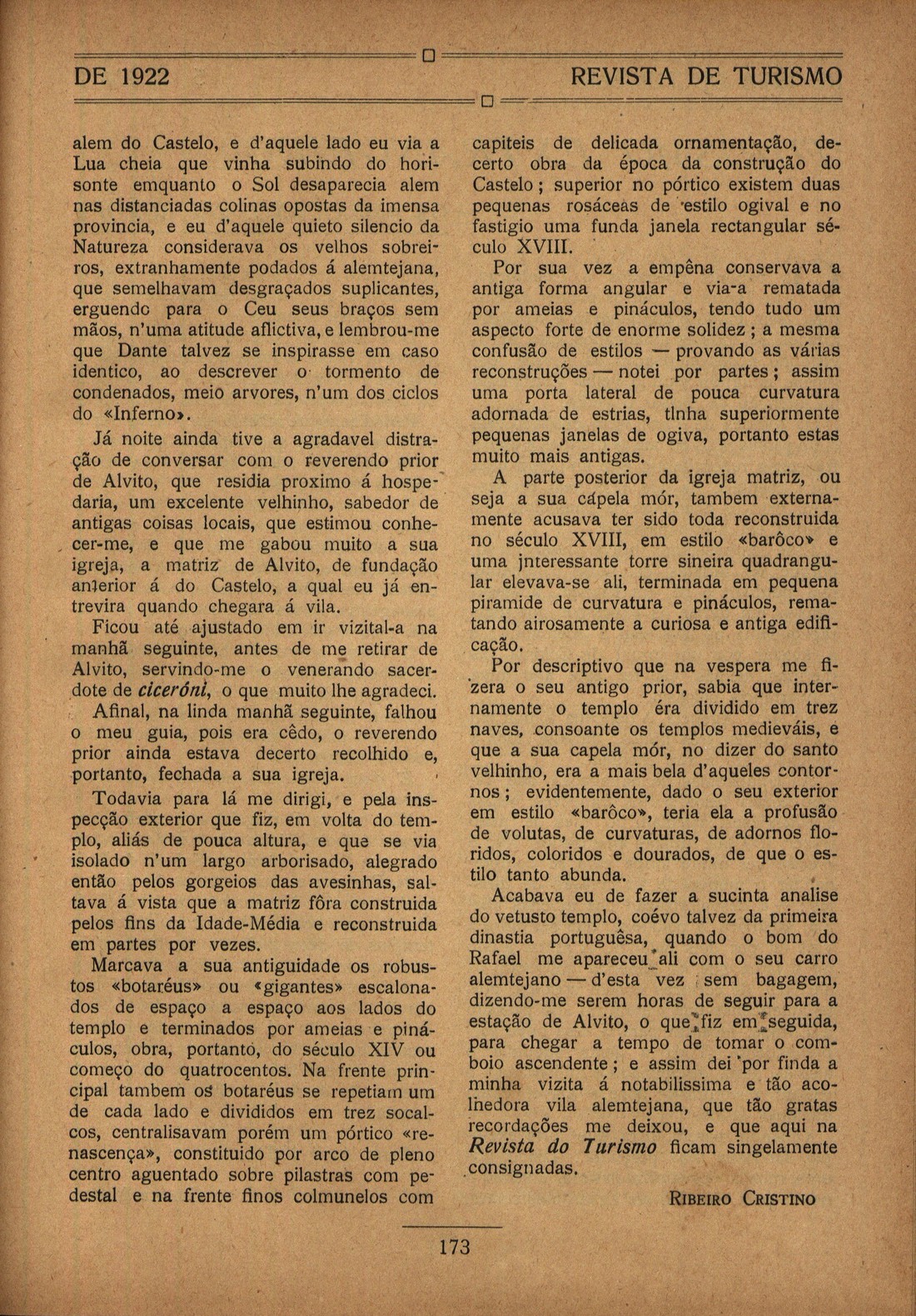 Revista de turismo: publicação quinzenal de turismo, propaganda, viagens, navegação, arte e literatura N.º 119, 5 Mai. 1922 A visita dos Americanos a Portugal, por J. L. Perante a América do Norte : a arte em Portugal : a janela do Convento de Cristo de Tomar, por Brandão Pereira Poetas e artistas : Canção, de António Botto Turismo e hipismo : o grande Concurso Hípico da Primavera, por J. L. Turismo estrangeiro : os Americanos na Europa, por Guerra Maio Portugal pitoresco : a Serra da Lapa e a Capela de Nossa Senhora Notícias diversas | N.º 119, 5 Mai. 1922 > Belezas Nacionais : um dia em Alvito, por Ribeiro Cristino > 0173 |