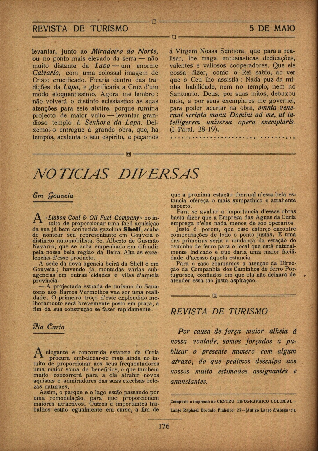 Revista de turismo: publicação quinzenal de turismo, propaganda, viagens, navegação, arte e literatura N.º 119, 5 Mai. 1922 A visita dos Americanos a Portugal, por J. L. Perante a América do Norte : a arte em Portugal : a janela do Convento de Cristo de Tomar, por Brandão Pereira Poetas e artistas : Canção, de António Botto Turismo e hipismo : o grande Concurso Hípico da Primavera, por J. L. Turismo estrangeiro : os Americanos na Europa, por Guerra Maio Portugal pitoresco : a Serra da Lapa e a Capela de Nossa Senhora Notícias diversas | N.º 119, 5 Mai. 1922 > Notícias diversas > 0176 |