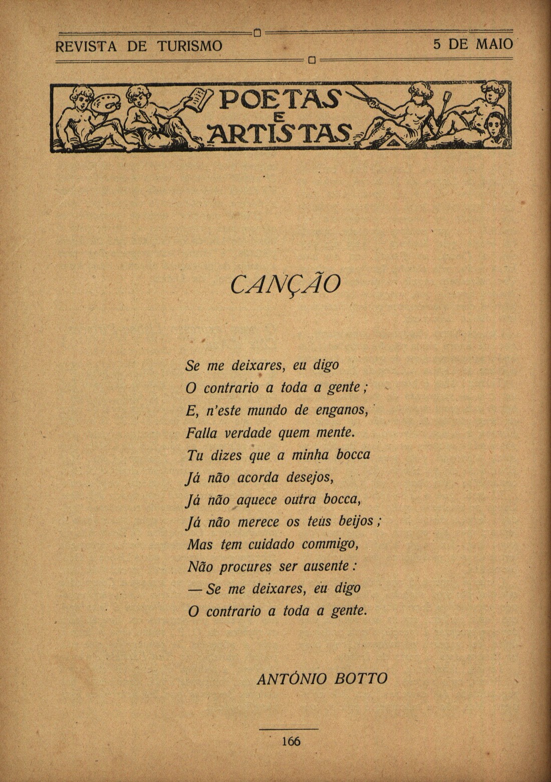 Revista de turismo: publicação quinzenal de turismo, propaganda, viagens, navegação, arte e literatura N.º 119, 5 Mai. 1922 A visita dos Americanos a Portugal, por J. L. Perante a América do Norte : a arte em Portugal : a janela do Convento de Cristo de Tomar, por Brandão Pereira Poetas e artistas : Canção, de António Botto Turismo e hipismo : o grande Concurso Hípico da Primavera, por J. L. Turismo estrangeiro : os Americanos na Europa, por Guerra Maio Portugal pitoresco : a Serra da Lapa e a Capela de Nossa Senhora Notícias diversas | N.º 119, 5 Mai. 1922 > Poetas e artistas : Canção, de António Botto > 0166 |
