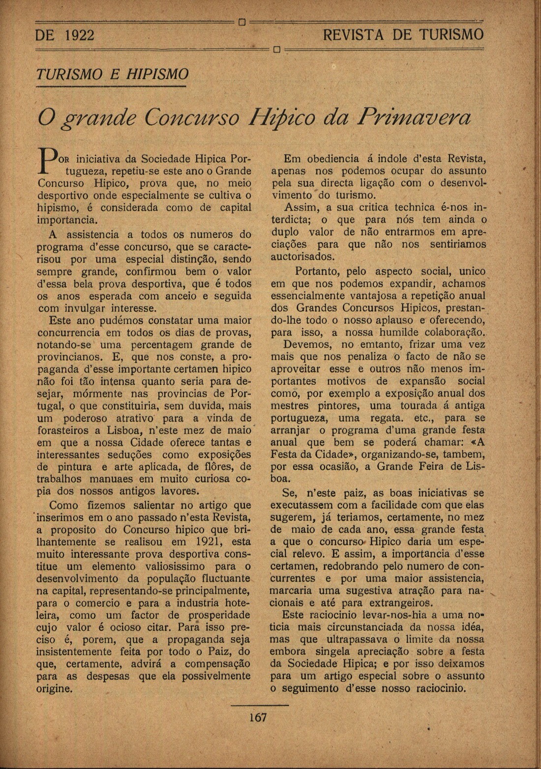 Revista de turismo: publicação quinzenal de turismo, propaganda, viagens, navegação, arte e literatura N.º 119, 5 Mai. 1922 A visita dos Americanos a Portugal, por J. L. Perante a América do Norte : a arte em Portugal : a janela do Convento de Cristo de Tomar, por Brandão Pereira Poetas e artistas : Canção, de António Botto Turismo e hipismo : o grande Concurso Hípico da Primavera, por J. L. Turismo estrangeiro : os Americanos na Europa, por Guerra Maio Portugal pitoresco : a Serra da Lapa e a Capela de Nossa Senhora Notícias diversas | N.º 119, 5 Mai. 1922 > Turismo e hipismo : o grande Concurso Hípico da Primavera, por J. L. > 0167 |