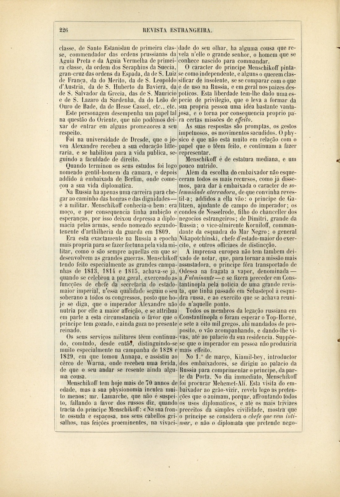 Revista estrangeira : jornal mensal N.º 7, 1854 [Chegada de um comboio de feridos a Bucharest] [Editorial] Nicolau Primeiro, imperador da Rússia | N.º 7, 1854 > A guerra do Oriente, ou os Russos e os Turcos (cont.) > 0226 |