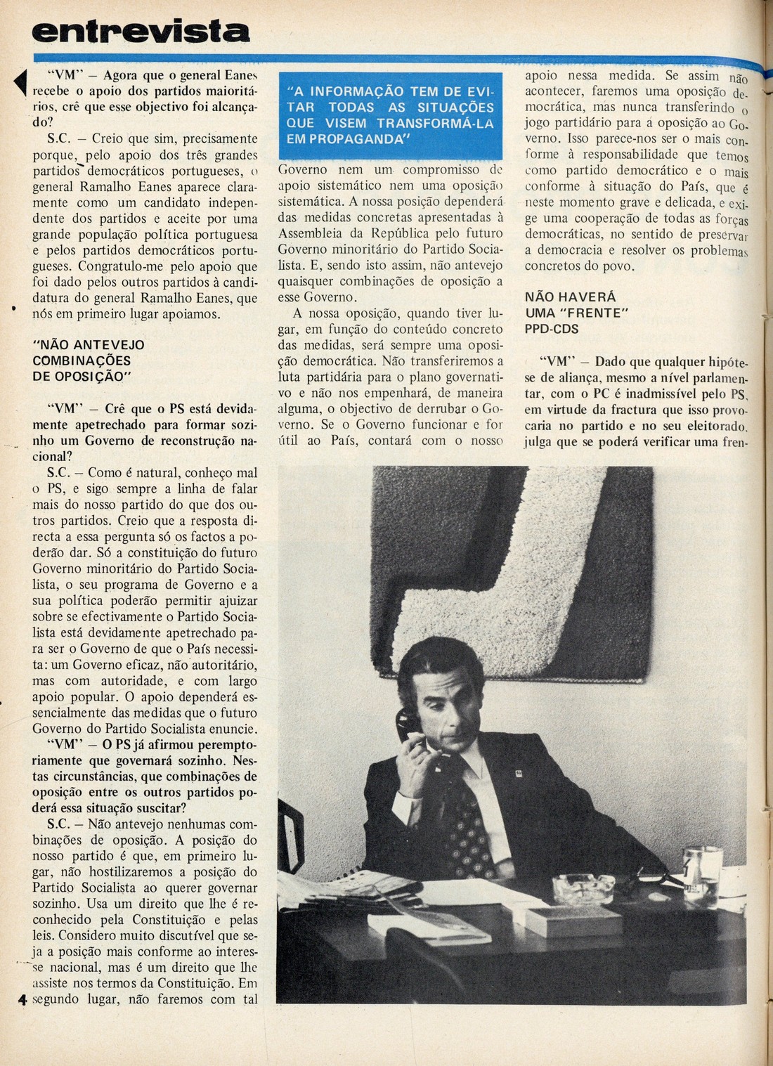 Vida mundial : documentário semanal da imprensa N.º 1888, 20 de Maio de 1976 capa publicidade Editorial, por Natália Correia Sumário Entrevista : Sá Carneiro : "A situação eoconómica pode provocar convulsões políticas" Presidenciais : quem está por detrás dos candidatos?, por A. M. Diplomacia : o mistério do aeroporto, por J. F. N. Electricidade : o consumidor paga a crise, por J. M. Desertores : 60 contos "em troca" da guerra ; Mário Soares : pausa para assinar "A la minuta" Os que riem... e os que choram IPC : um roubo ao povo português, por Dórdio Guimarães Os surdos : coincidências (ab)surdas, por Oto Rino Sondagem : porque não votaram os portugueses? Educação : Associações de Pais denunciam : o ensino pode ser instrumento para a conquista do poder Separata : Deus venha com a fartura que a fome ninguém a atura Cinema : "Solaris" : reinventar o futuro, por Dórdio Guimarães Marionetas : histórias medievais de mortes e enganos, por João Nordeste Teatro : "Equus" : RTP "proíbe" nudez teatral, por C. P. Relações franco-americanas : a Oeste nada de novo, por Saint-Robert Seminário sobre informação para (poucos) jornalistas, por A. M. ; Maria Lamas : uma outra homenagem, por Afonso Manta Justiça : Costa Gomes "julgado" à porta fechada, por J. M. ; Açores : as "manobras" são outras" ; Imprensa : a lei da mordaça, por D. A. publicidade contracapa | N.º 1888, 20 de Maio de 1976 > Entrevista : Sá Carneiro : "A situação eoconómica pode provocar convulsões políticas" > 0004 |