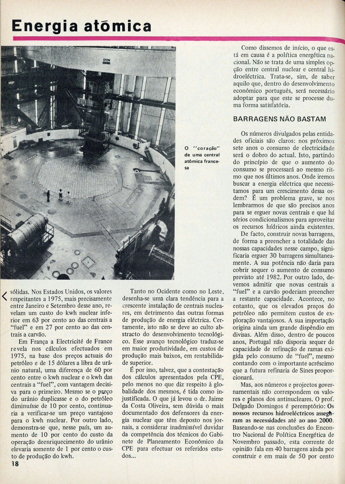Vida mundial : documentário semanal da imprensa N.º 1889, 27 de Maio de 1976 capa publicidade Editorial, por Natália Correia Sumário Presidenciais : Partidos em crise : quem aproveita?, por A. M. ; Conselhos ao General, por F. F. O candidato mais excêntrico "Retornados" : à espera da manifestação, por M. R. F. ; Capitão Fernandes : do golpismo à produção literária Almoço na relva [cartoon], por António Os que riem... e os que choram A la minuta História : filha de D. Carlos pergunta : Onde estão as obras de arte da família real portuguesa?, por J. F. N. Publicidade Separata : Revista : sal e pimenta do espírito português Autores : os equívicos do Dr. Rebelo, por Jorge Guimarães Livros Cinema Bailado : "Jok" da Moldávia : os amigos são para as ocasiões, por João Nordeste ; TV : o mesmo selo na origem dos deslizes, por S. L. Medicina : crianças : sexo à escolha França-Alemanha : acusações injustas ao Gaullismo, por Saint-Robert Internacional Terreiro do Paço : outra cor para a "sala de visitas, por M. R. F. ; Coelhos : vêm aí os chineses, por F. F. Greves : quem está por detrrás?, por J. A. Os surdos : IS - Intervenção surda, por Oto Rino Publicidade publicidade contracapa | N.º 1889, 27 de Maio de 1976 > Energia atómica : maquinações políticas por detrás da central, por J. M. > 0018 |