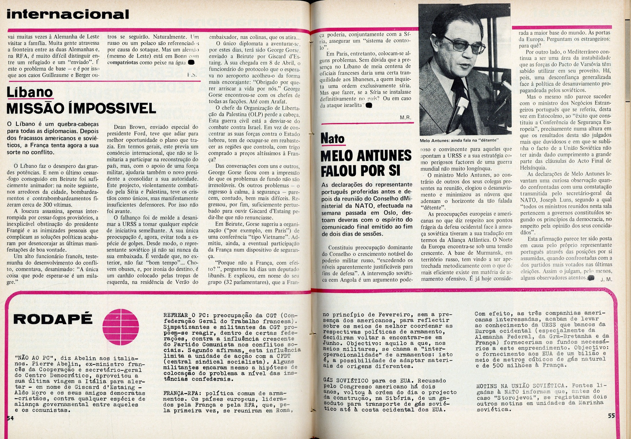 Vida mundial : documentário semanal da imprensa N.º 1889, 27 de Maio de 1976 capa publicidade Editorial, por Natália Correia Sumário Presidenciais : Partidos em crise : quem aproveita?, por A. M. ; Conselhos ao General, por F. F. O candidato mais excêntrico "Retornados" : à espera da manifestação, por M. R. F. ; Capitão Fernandes : do golpismo à produção literária Almoço na relva [cartoon], por António Os que riem... e os que choram A la minuta História : filha de D. Carlos pergunta : Onde estão as obras de arte da família real portuguesa?, por J. F. N. Publicidade Separata : Revista : sal e pimenta do espírito português Autores : os equívicos do Dr. Rebelo, por Jorge Guimarães Livros Cinema Bailado : "Jok" da Moldávia : os amigos são para as ocasiões, por João Nordeste ; TV : o mesmo selo na origem dos deslizes, por S. L. Medicina : crianças : sexo à escolha França-Alemanha : acusações injustas ao Gaullismo, por Saint-Robert Internacional Terreiro do Paço : outra cor para a "sala de visitas, por M. R. F. ; Coelhos : vêm aí os chineses, por F. F. Greves : quem está por detrrás?, por J. A. Os surdos : IS - Intervenção surda, por Oto Rino Publicidade publicidade contracapa | N.º 1889, 27 de Maio de 1976 > Internacional > Líbano : missão impossível, por M. R. ; NATO : Melo Antunes falou por si, por J. M. > 0054-0055 |
