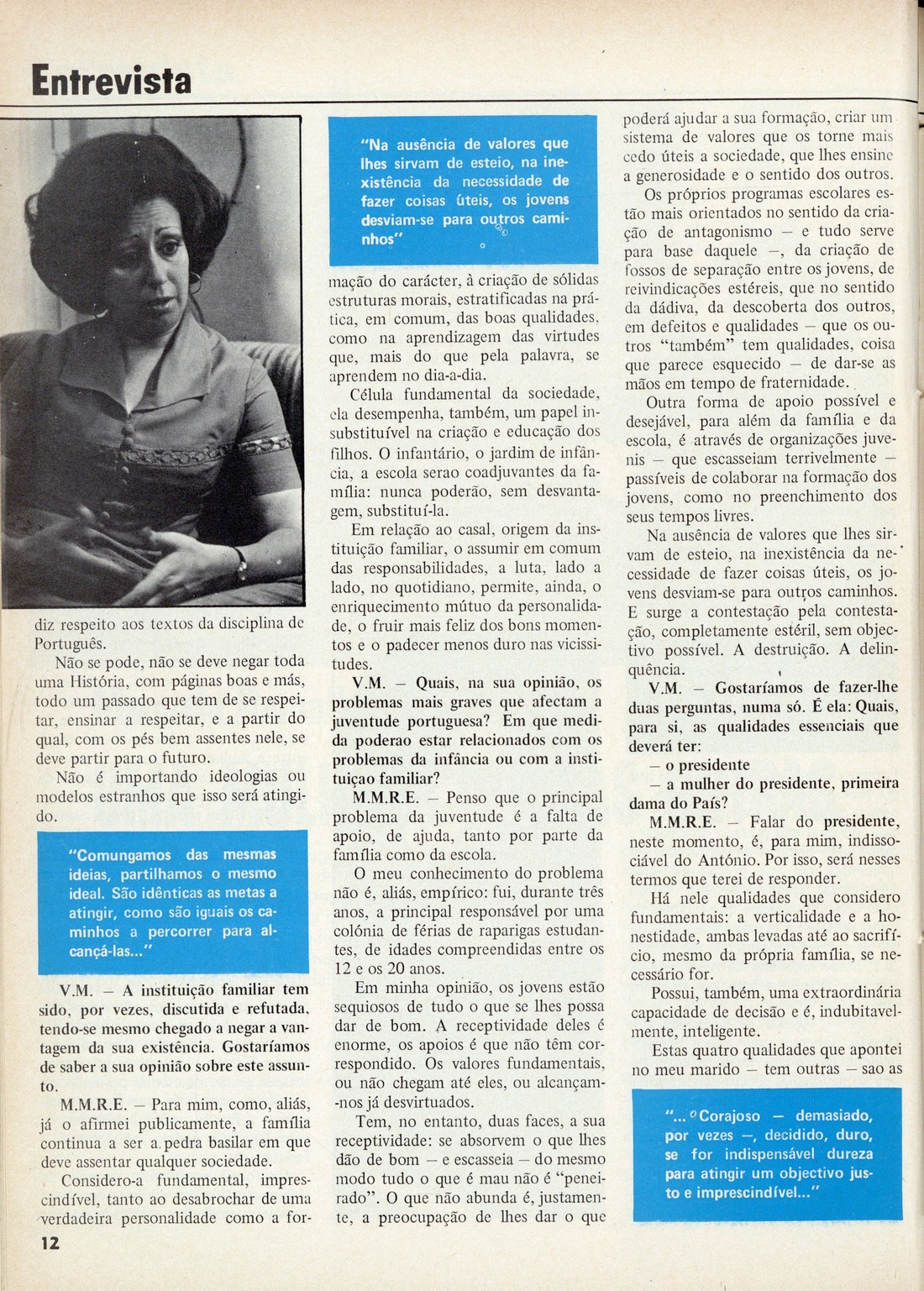 Vida mundial : documentário semanal da imprensa N.º 1895, 8 de Julho de 1976 capa publicidade Editorial, por Natália Correia publicidade Sumário Festival da Força Aérea Crónica : será a revolução reaccionária?, por Cândido Quem vai pagar o desequilíbrio?, por F. F. Entrevista : Manuela Ramalho Eanes : uma mulher como as outras, por Manuela de Sousa Rama Os surdos : um engano silencioso, por Oto Rino Polémica : Cinema : ainda o caso do IPC, por Dórdio Guimarães Uma canção para a Europa [cartoon] Separata : máscaras e mascarados Entrevista : Presidente do PS : Angola, eleições e partido. Pagarão os mercenários pela FNLA?, por Francisco de Sequeiros Cinema : Quando as aberrações acabam bem ; Quase um bom fantástico, por Dórdio Guimarães Teatro : Adóque : mocada rija nas forças democráticas, por João Nordeste TV : quando a TV acerta, por Dórdio Guimarães Os que riem... e os que choram A la minuta Internacional : "Comandos atacaram à meia-noite" : da (duvidosa) moralidade à "segura eficácia", por C. P. C. ; Polónia : acontecimentos para breve, por J. A. Uma certa informação, por J. M. publicidade contracapa | N.º 1895, 8 de Julho de 1976 > Entrevista : Manuela Ramalho Eanes : uma mulher como as outras, por Manuela de Sousa Rama > 0012 |