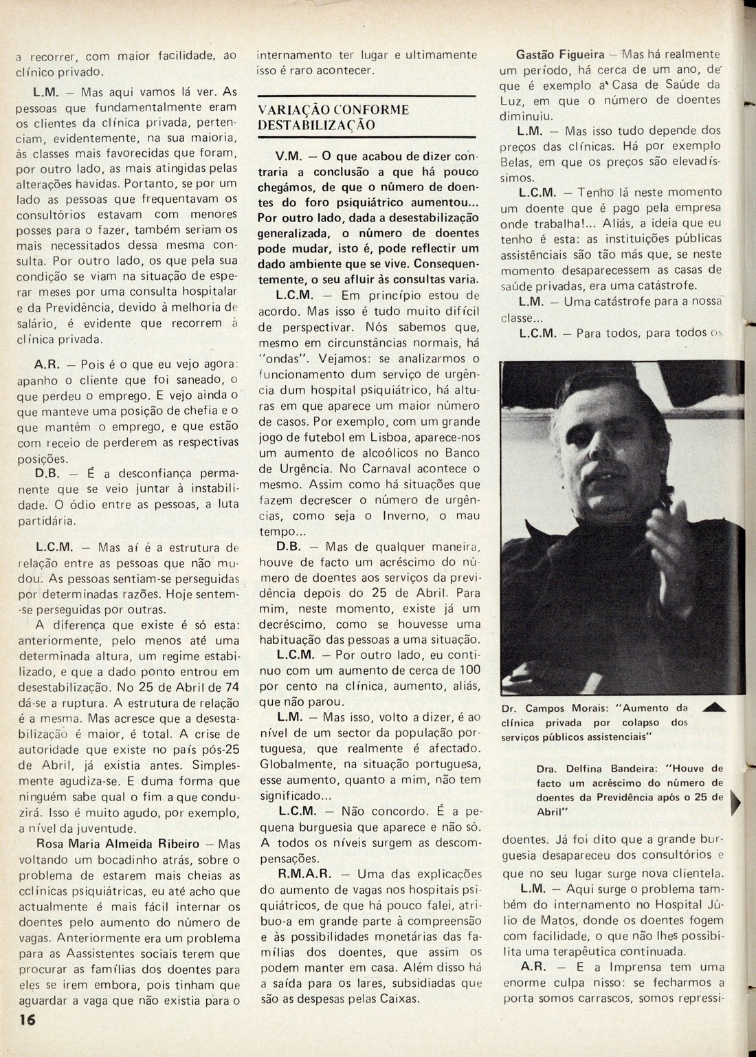 Vida mundial : documentário semanal da imprensa N.º 1895, 8 de Julho de 1976 capa publicidade Editorial, por Natália Correia publicidade Sumário Festival da Força Aérea Crónica : será a revolução reaccionária?, por Cândido Quem vai pagar o desequilíbrio?, por F. F. Entrevista : Manuela Ramalho Eanes : uma mulher como as outras, por Manuela de Sousa Rama Os surdos : um engano silencioso, por Oto Rino Polémica : Cinema : ainda o caso do IPC, por Dórdio Guimarães Uma canção para a Europa [cartoon] Separata : máscaras e mascarados Entrevista : Presidente do PS : Angola, eleições e partido. Pagarão os mercenários pela FNLA?, por Francisco de Sequeiros Cinema : Quando as aberrações acabam bem ; Quase um bom fantástico, por Dórdio Guimarães Teatro : Adóque : mocada rija nas forças democráticas, por João Nordeste TV : quando a TV acerta, por Dórdio Guimarães Os que riem... e os que choram A la minuta Internacional : "Comandos atacaram à meia-noite" : da (duvidosa) moralidade à "segura eficácia", por C. P. C. ; Polónia : acontecimentos para breve, por J. A. Uma certa informação, por J. M. publicidade contracapa | N.º 1895, 8 de Julho de 1976 > Aumentam as doenças mentais?, por F. Guerra > 0016 |