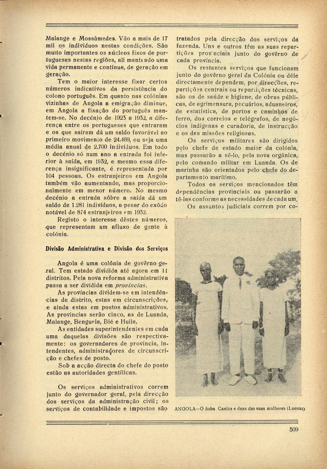 O Império Português na primeira Exposição Colonial Portuguesa : álbum-catálogo oficial Sumário capa verso publicidade publicidade publicidade publicidade anterrosto verso rosto verso General António Óscar de Fragoso Carmona, Presidente da República [ilustração] Doutor António de Oliveira Salazar, Presidente do Conselho de Ministros e Ministro das Finanças Doutor Armindo Monteiro, Ministro das Colónias Doutor Francisco Vieira Machado, Sub-secretário do Estado das Colónias Tenente Henrique Galvão, Director técnico da Exposição Colonial Portuguesa O passado A obra colonizadora dos últimos anos O Porto d'ontem, d'hoje e d'amanhã I. O Porto d'ontem publicidade Regiões de Turismo: três belas excursões I. Porto - Mindelo - Azurara - Vila do Conde - Póvoa do Varzim - Fão - Esposende - Viana do Castelo - Ponte de Lima - Braga Chaves: a princesa do Tâmega, por Júlio Xavier Júnior II. Porto - Francelos - Miramar - Aguda - Granja - Espinho - Ovar - Vila da Feira - Aveiro publicidade III. Porto - S. João da Madeira - Oliveira de Azemeis - Curia - Luso - Buçaco - Coimbra Umas palavras sobre alguns aspectos de organização administrativa colonial, por [João de Azevedo Coutinho] Cabo Verde: o arquipélago da melancolia vive o esforço duma importante realização económica, por Machado Saldanha Angola, por Artur d'Almeida d'Eça Moçambique, por António Barradas publicidade Roteiro: resumo elucidativo do visitante da Primeira Exposição Colonial Portuguesa Expositores verso contracapa | Sumário > Angola, por Artur d'Almeida d'Eça > 0309 |