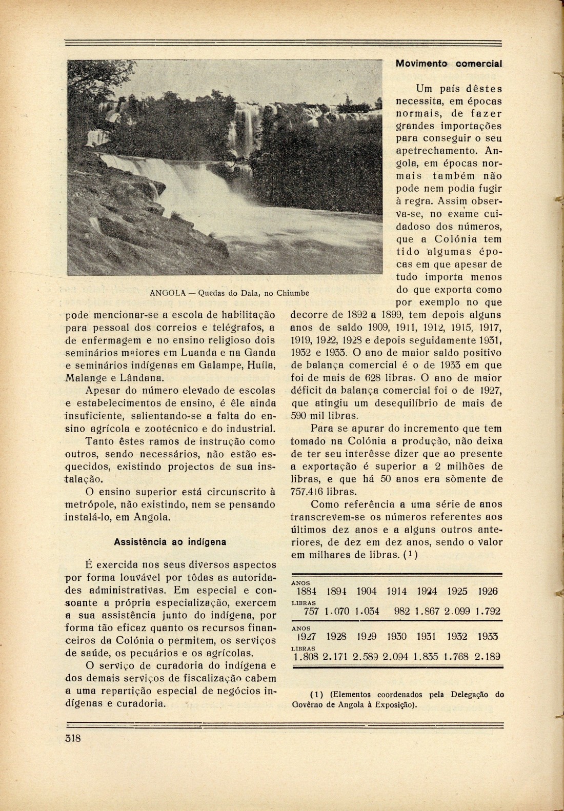 O Império Português na primeira Exposição Colonial Portuguesa : álbum-catálogo oficial Sumário capa verso publicidade publicidade publicidade publicidade anterrosto verso rosto verso General António Óscar de Fragoso Carmona, Presidente da República [ilustração] Doutor António de Oliveira Salazar, Presidente do Conselho de Ministros e Ministro das Finanças Doutor Armindo Monteiro, Ministro das Colónias Doutor Francisco Vieira Machado, Sub-secretário do Estado das Colónias Tenente Henrique Galvão, Director técnico da Exposição Colonial Portuguesa O passado A obra colonizadora dos últimos anos O Porto d'ontem, d'hoje e d'amanhã I. O Porto d'ontem publicidade Regiões de Turismo: três belas excursões I. Porto - Mindelo - Azurara - Vila do Conde - Póvoa do Varzim - Fão - Esposende - Viana do Castelo - Ponte de Lima - Braga Chaves: a princesa do Tâmega, por Júlio Xavier Júnior II. Porto - Francelos - Miramar - Aguda - Granja - Espinho - Ovar - Vila da Feira - Aveiro publicidade III. Porto - S. João da Madeira - Oliveira de Azemeis - Curia - Luso - Buçaco - Coimbra Umas palavras sobre alguns aspectos de organização administrativa colonial, por [João de Azevedo Coutinho] Cabo Verde: o arquipélago da melancolia vive o esforço duma importante realização económica, por Machado Saldanha Angola, por Artur d'Almeida d'Eça Moçambique, por António Barradas publicidade Roteiro: resumo elucidativo do visitante da Primeira Exposição Colonial Portuguesa Expositores verso contracapa | Sumário > Angola, por Artur d'Almeida d'Eça > 0318 |