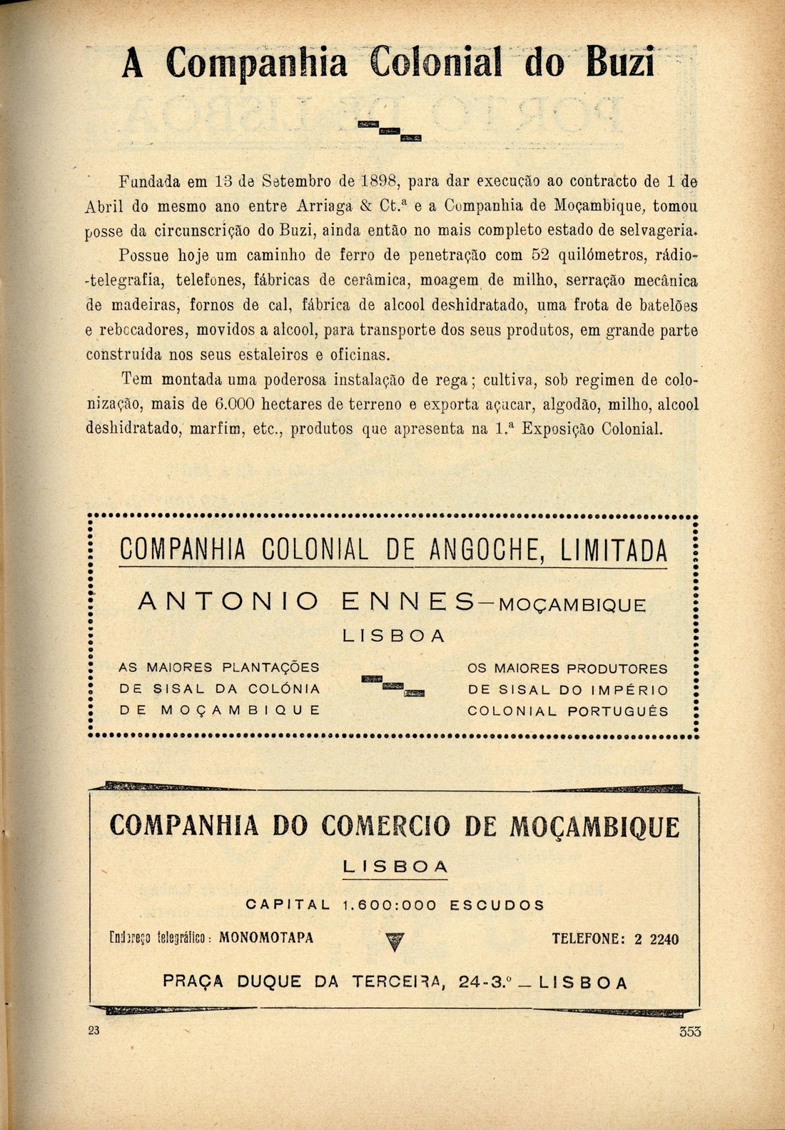 O Império Português na primeira Exposição Colonial Portuguesa : álbum-catálogo oficial Sumário capa verso publicidade publicidade publicidade publicidade anterrosto verso rosto verso General António Óscar de Fragoso Carmona, Presidente da República [ilustração] Doutor António de Oliveira Salazar, Presidente do Conselho de Ministros e Ministro das Finanças Doutor Armindo Monteiro, Ministro das Colónias Doutor Francisco Vieira Machado, Sub-secretário do Estado das Colónias Tenente Henrique Galvão, Director técnico da Exposição Colonial Portuguesa O passado A obra colonizadora dos últimos anos O Porto d'ontem, d'hoje e d'amanhã I. O Porto d'ontem publicidade Regiões de Turismo: três belas excursões I. Porto - Mindelo - Azurara - Vila do Conde - Póvoa do Varzim - Fão - Esposende - Viana do Castelo - Ponte de Lima - Braga Chaves: a princesa do Tâmega, por Júlio Xavier Júnior II. Porto - Francelos - Miramar - Aguda - Granja - Espinho - Ovar - Vila da Feira - Aveiro publicidade III. Porto - S. João da Madeira - Oliveira de Azemeis - Curia - Luso - Buçaco - Coimbra Umas palavras sobre alguns aspectos de organização administrativa colonial, por [João de Azevedo Coutinho] Cabo Verde: o arquipélago da melancolia vive o esforço duma importante realização económica, por Machado Saldanha Angola, por Artur d'Almeida d'Eça Moçambique, por António Barradas publicidade Roteiro: resumo elucidativo do visitante da Primeira Exposição Colonial Portuguesa Expositores verso contracapa | Sumário > Moçambique, por António Barradas > A Companhia Colonial do Buzi > 0353 |